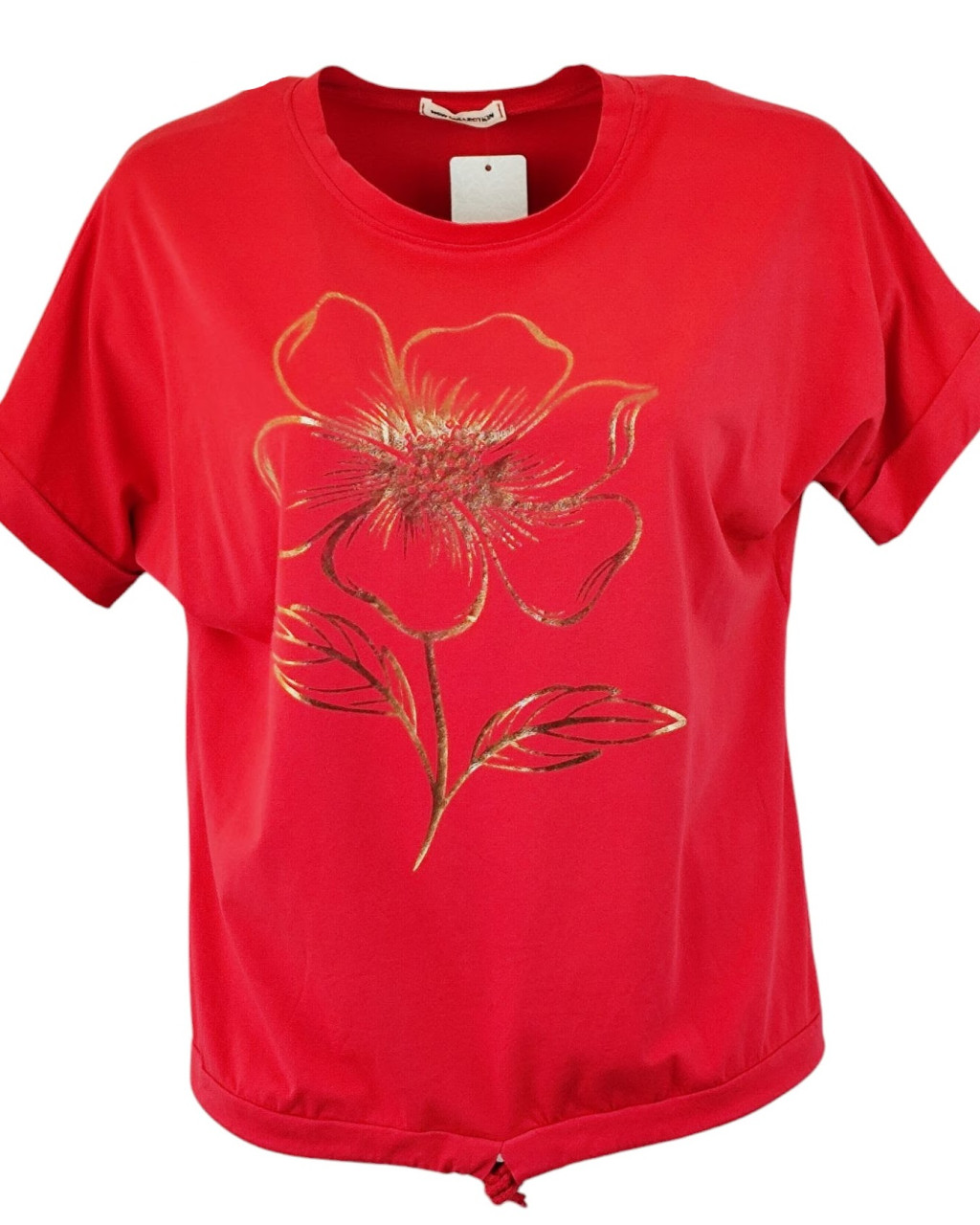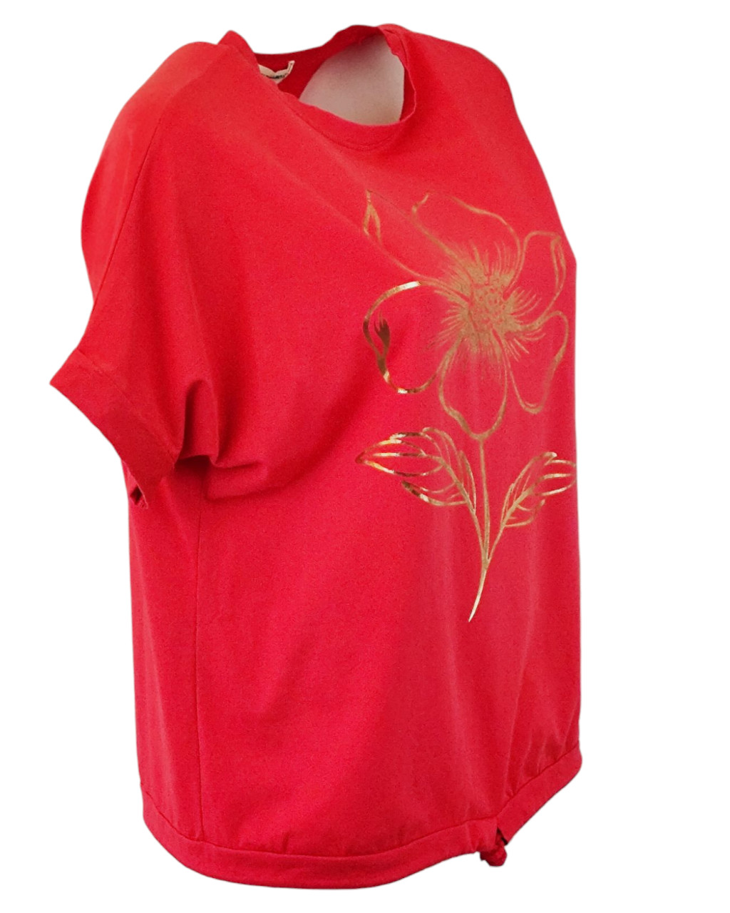 Nagy arany virágos elejű, rövid ujjú, környakú, fiatalos, pamut, olasz felsőrész, meghúzható kötővel az alján- piros