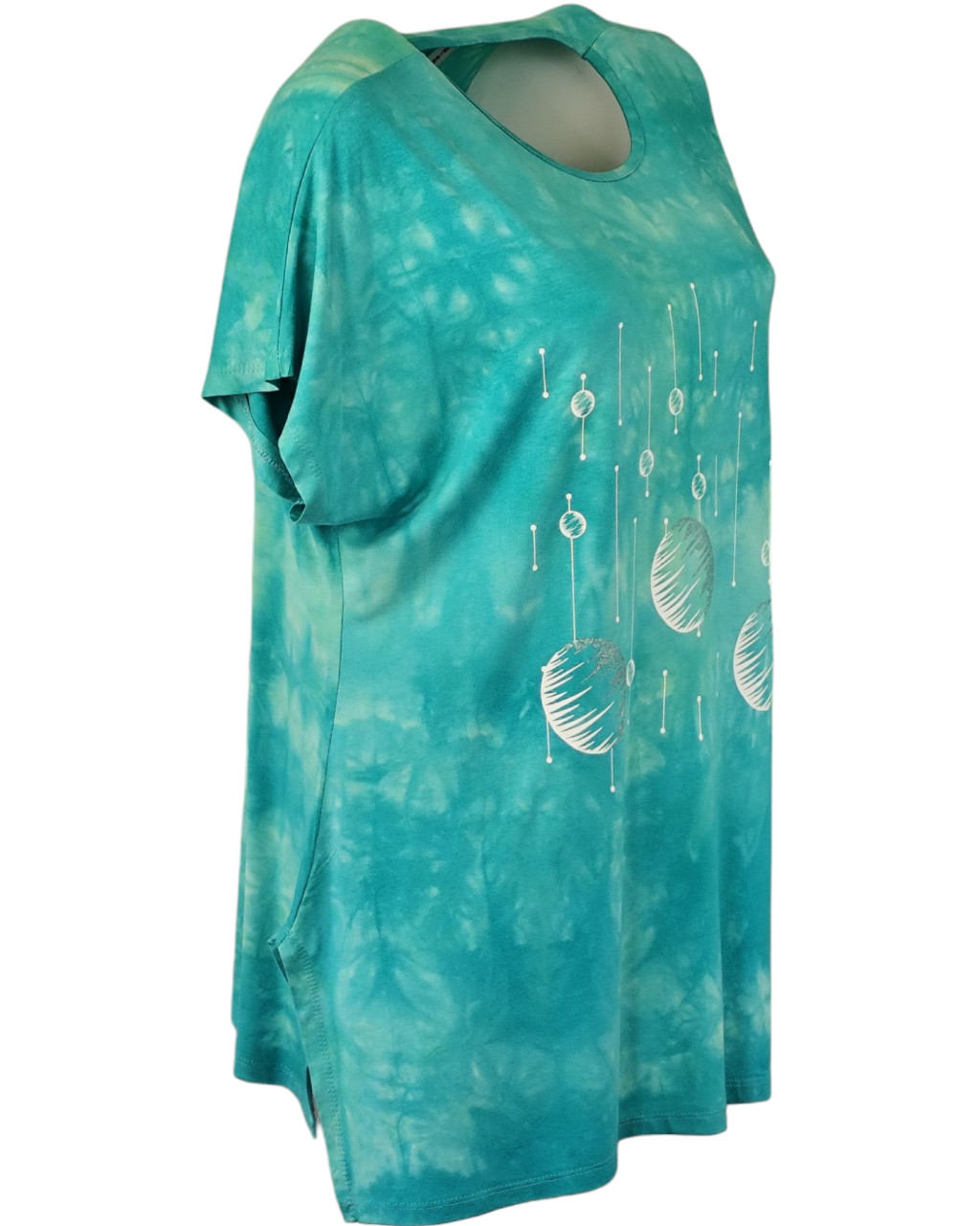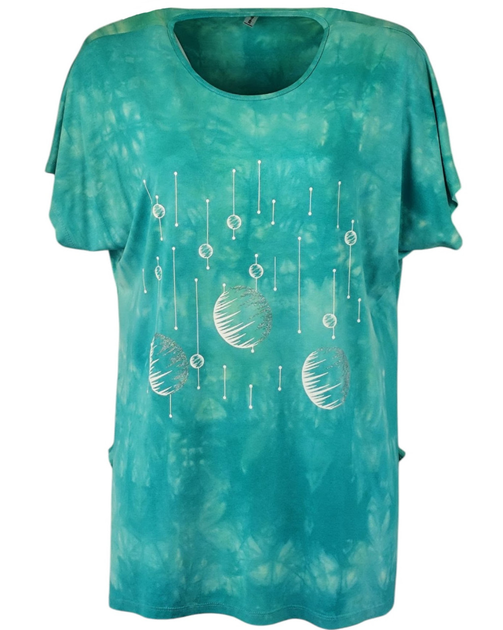 Lily batikolt pamut anyagú, rövidujjú, környakú, hosszított fazonú, "A"- vonalú, molett pamut török tunika, fehér mintával az elején- türkíz zöld