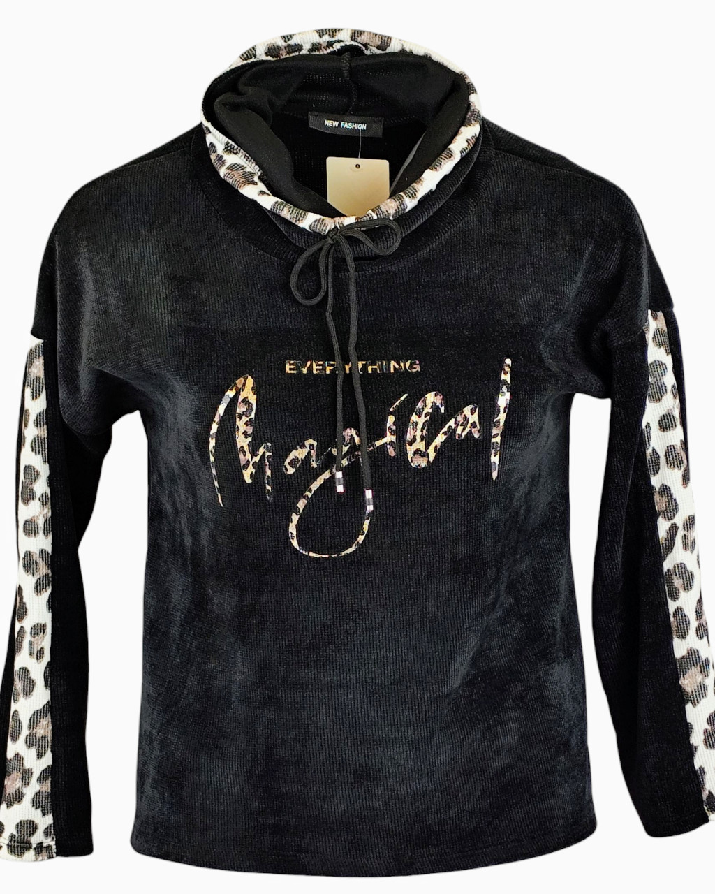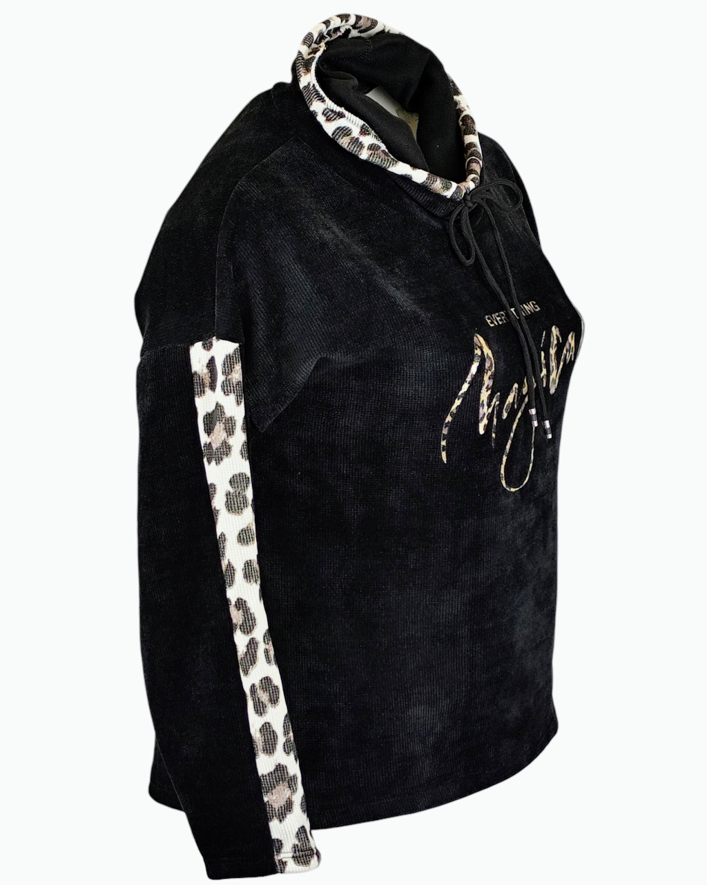 Vastag bordás anyagú, feliratos elejű, hosszú ujjú, garbó nyakú, fiatalos olasz felső, ocelot állatminta díszítéssel- fekete