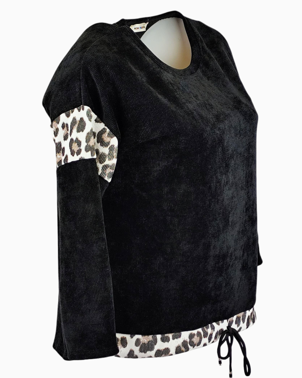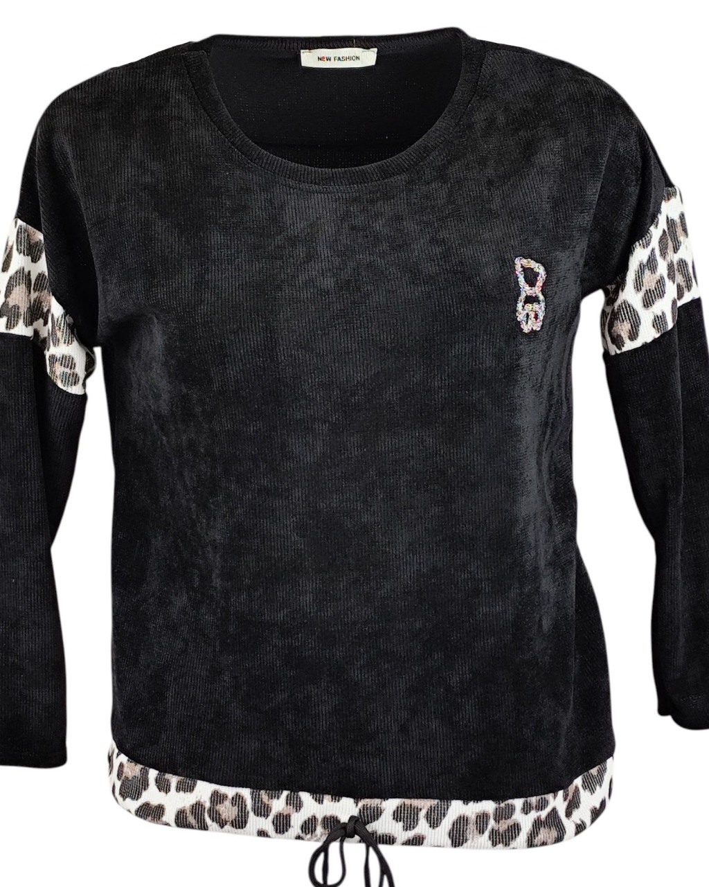 Vastag bordás anyagú, ocelot állatmintával díszített, egyszínű, hosszú ujjú, környakú, fiatalos olasz felsőrész, kis mackóval- fekete