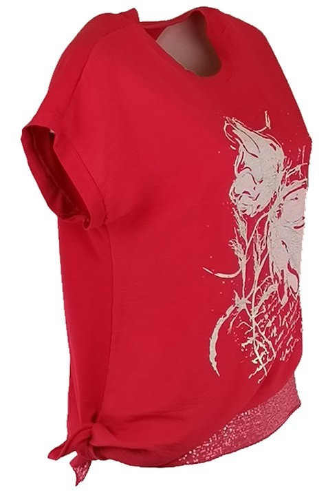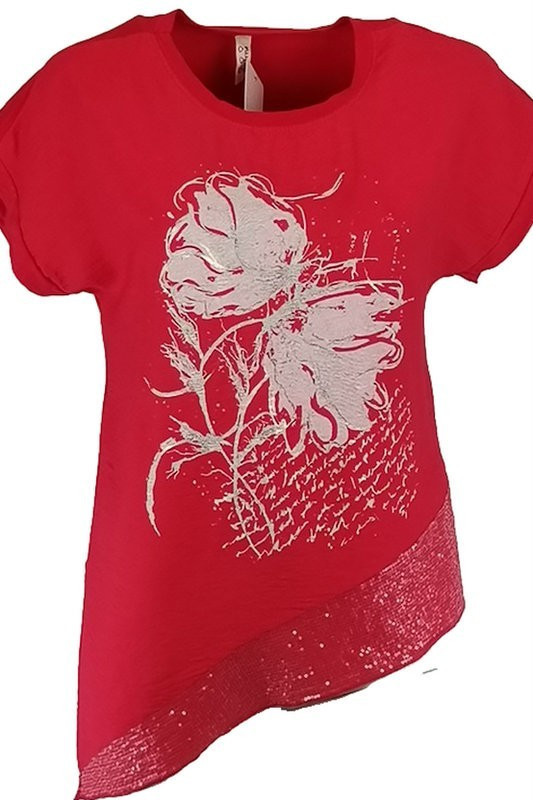 Aszimmetrikus flitteres aljú, oldalra megköthető, rövid ujjú, környakú, olasz felsőrész fehér virágokkal az elején- piros, fehér