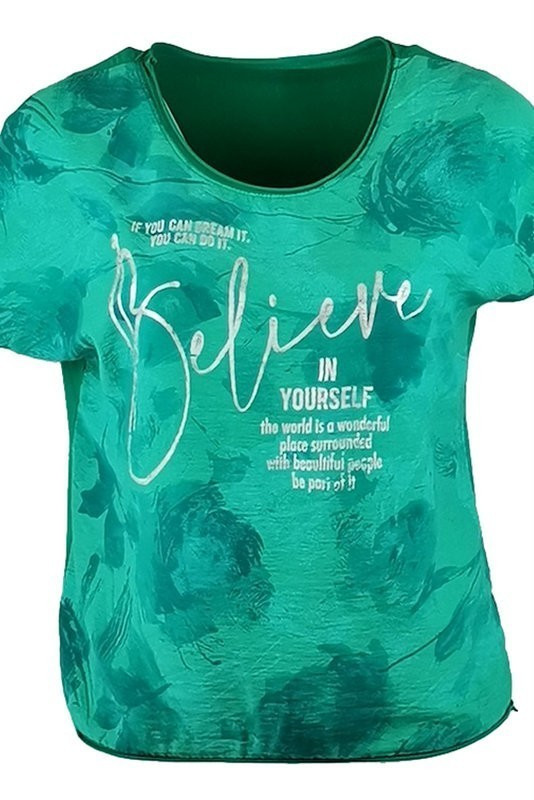 Belive arany feliratos batikolt elejű, hátul sima egyszínű pamut, rövid ujjú, környakú, fiatalos olasz felsőrész- türkíz zöld
