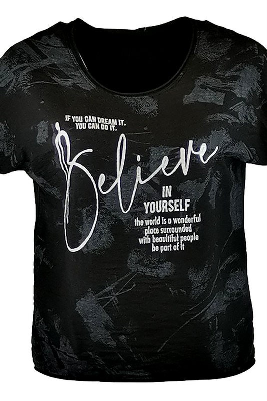 Belive arany feliratos batikolt elejű, hátul sima egyszínű pamut, rövid ujjú, környakú, fiatalos olasz felsőrész- fekete