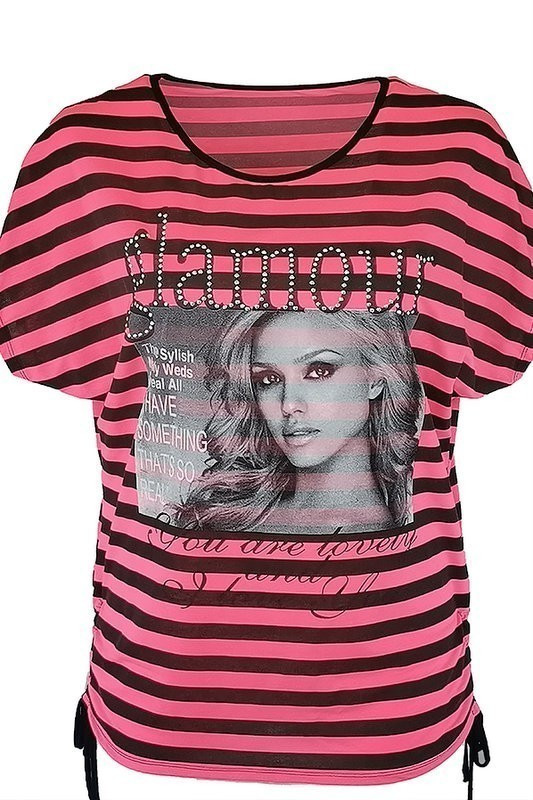 Glamour lány fej képes elejű, pink fekete csíkos, kétoldalt összehúzható aljú, rövid ujjú, környakú, fiatalos nyári olasz felsőrész- pink, fekete
