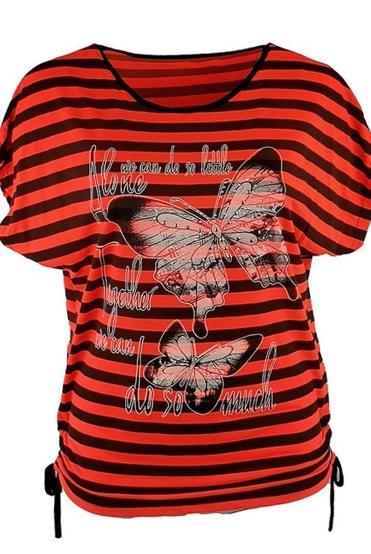 Glamour pillangós elejű, narancssárga fekete csíkos, kétoldalt összehúzható aljú, rövid ujjú, környakú, fiatalos nyári olasz felsőrész- narancssárga, fekete