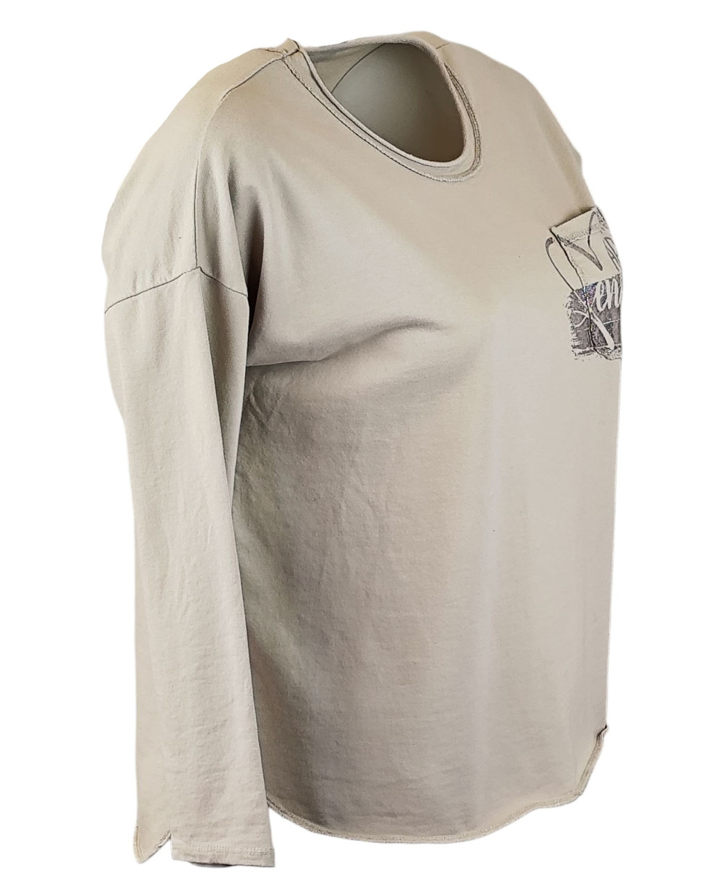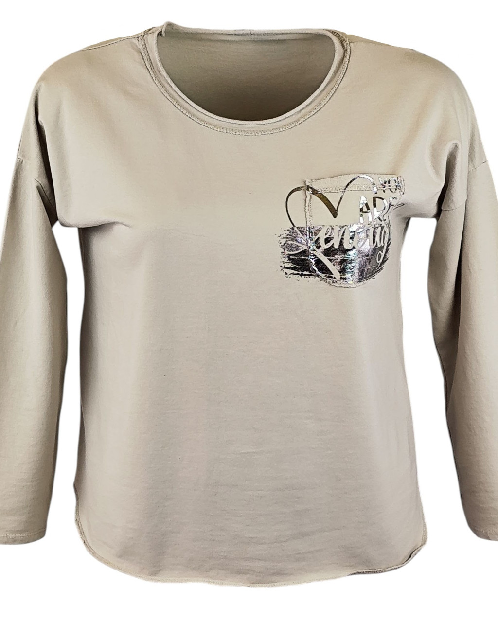 Kis ezüstös szív mintával díszített, sima pamut anyagból készült, hosszú ujjú, környakú, olasz fiatalos felsőrész- drapp