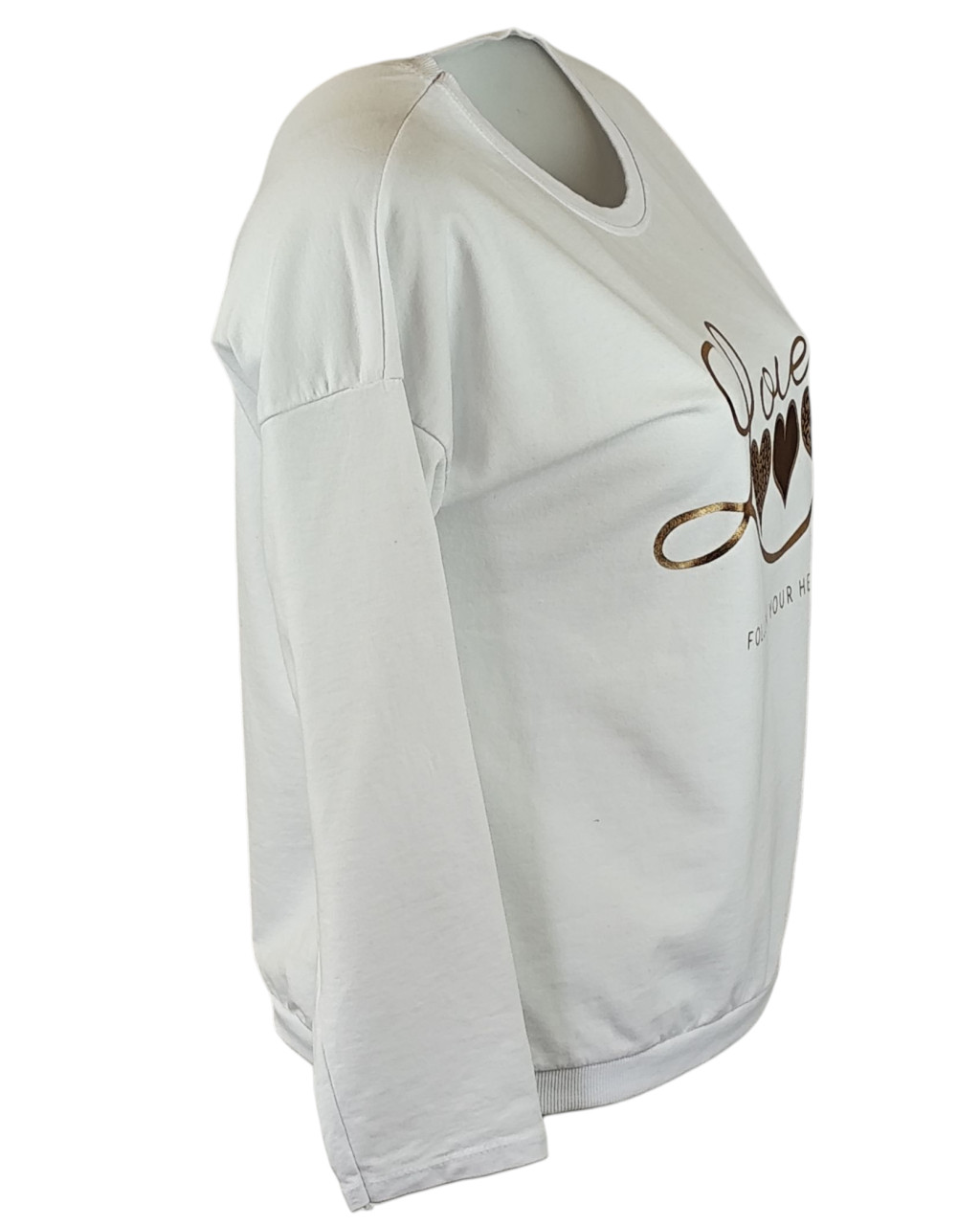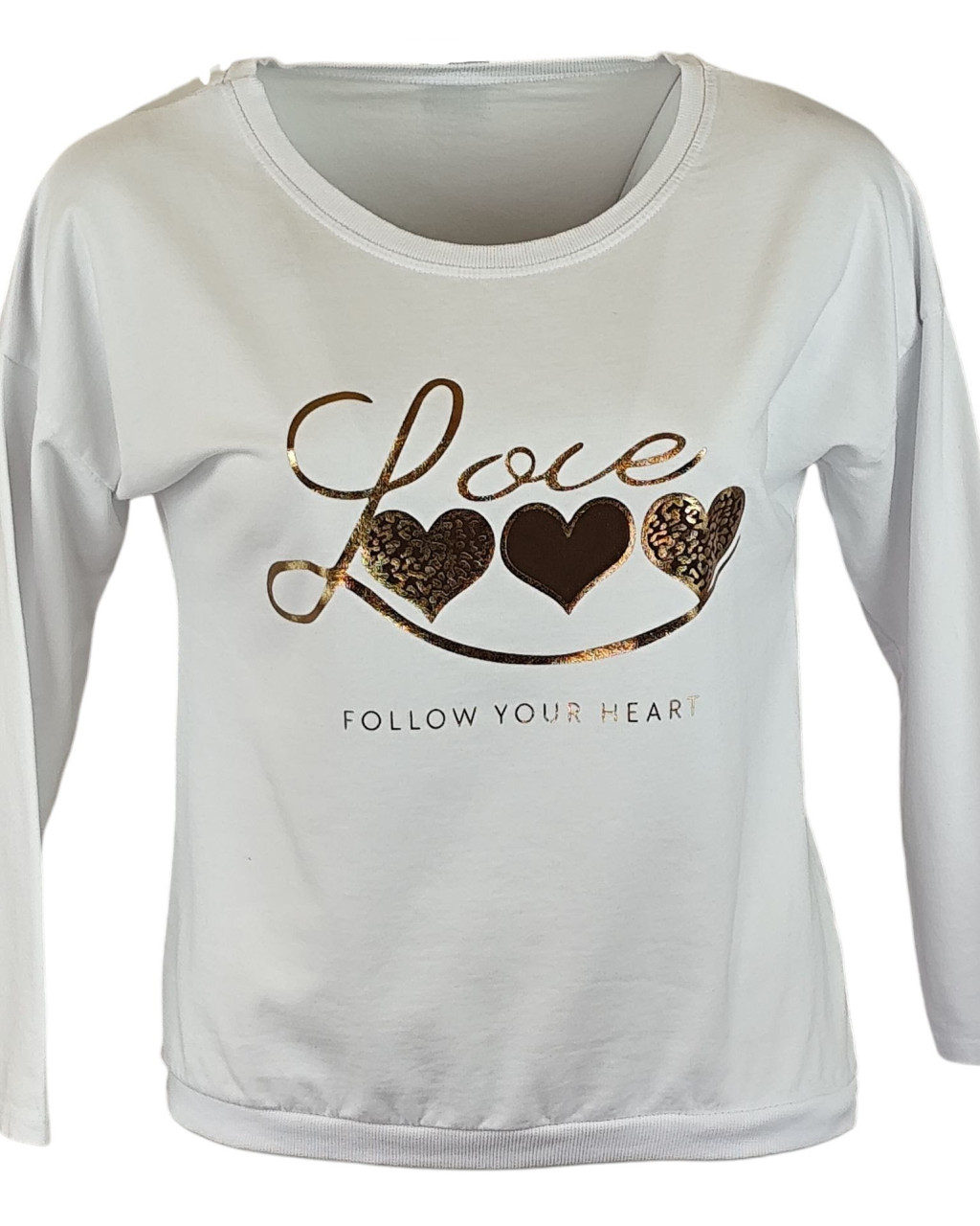 Love arany szíves feliratos fiatalos passzé aljú és ujjú pamut pulóver- krémfehér
