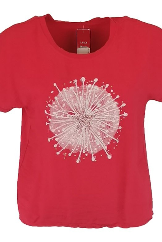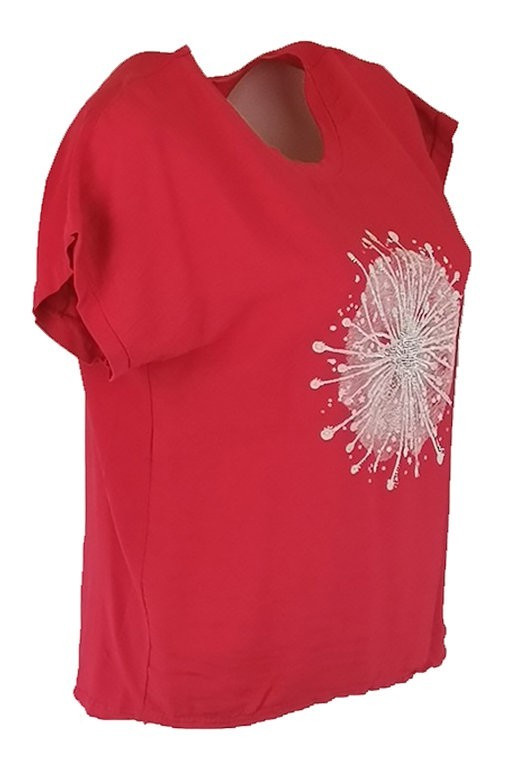 Óriás fehér pitypang fej mintás elejű, hátul sima egyszínű pamut anyagból készült, rövid ujjú, környakú, fiatalos olasz felsőrész- piros, fehér