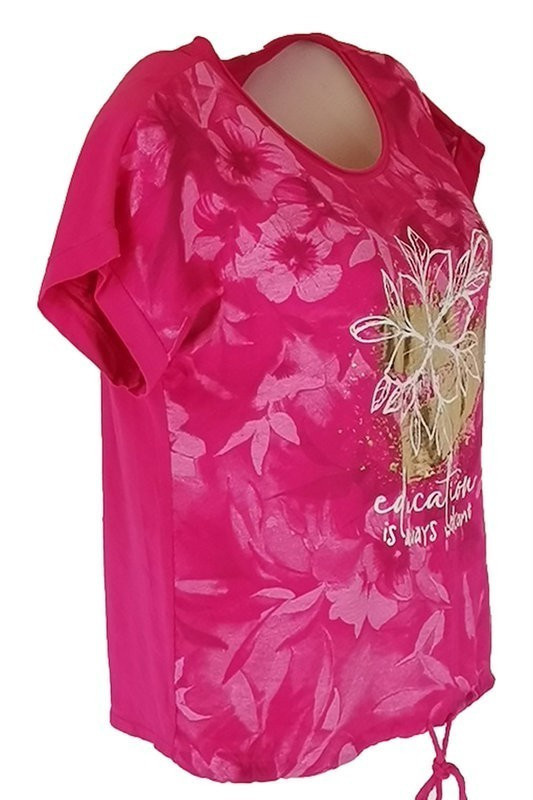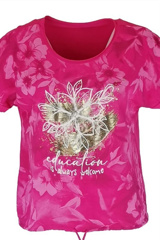 Education feliratos, nagy arany virágos, batikolt elejű, hátul sima egyszínű pamut, rövid ujjú, környakú, fiatalos olasz felsőrész, alul meghúzható zsinórral- pink, fehér, arany