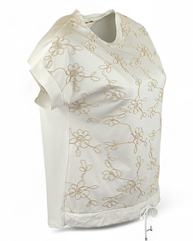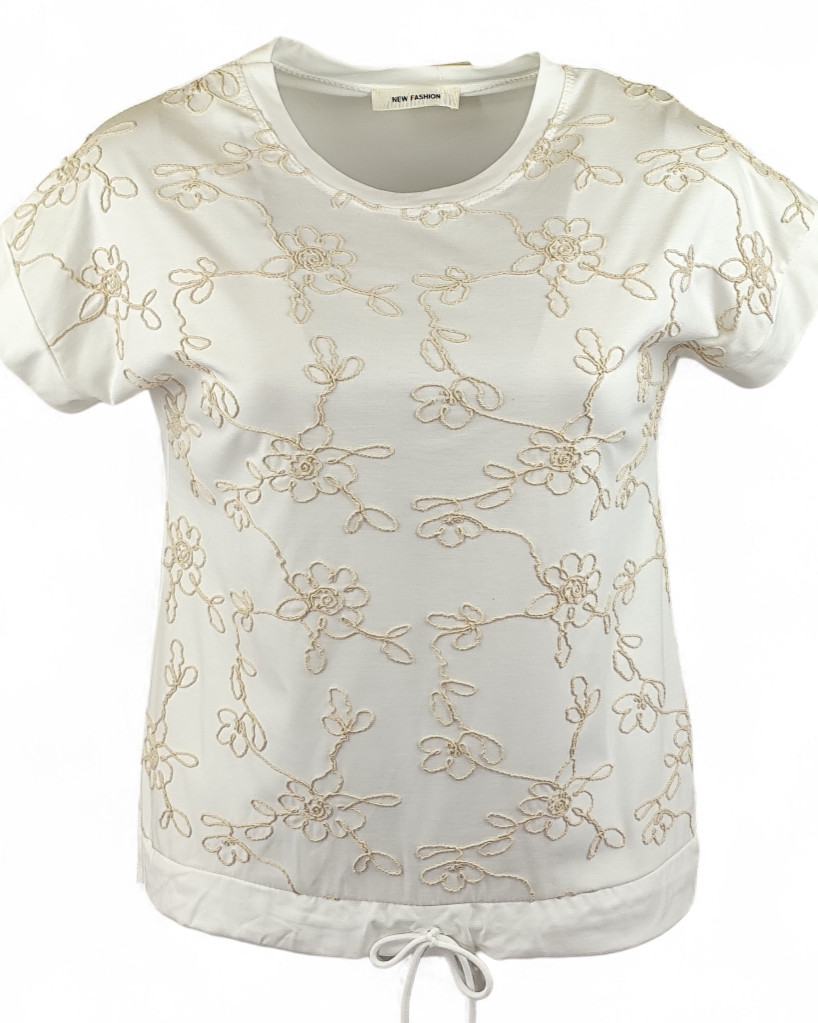 Natúr madzaggal hímzett elejű, környakú, rövid ujjú, viszkóz anyagból készült, fiatalos felsőrész, húzható zsinórral az alján- fehér