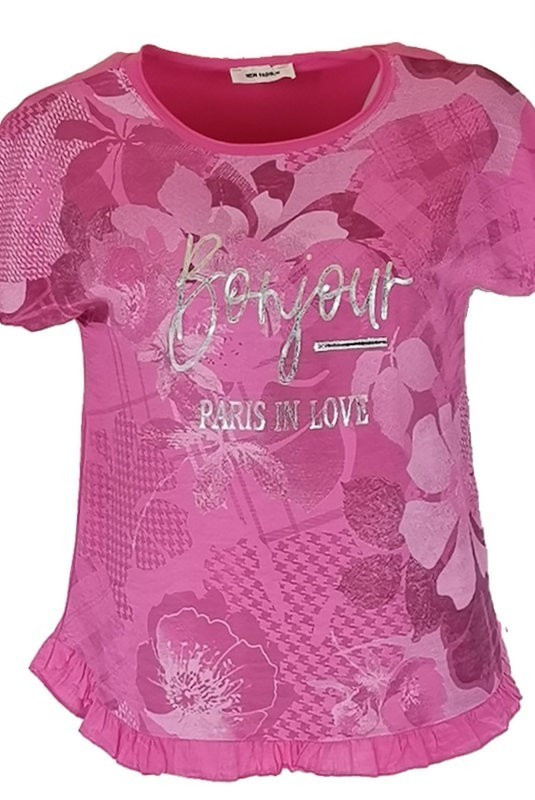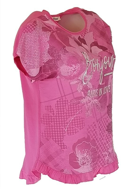 Fodros aljú, ezüst bonjour feliratos virágos elejű, hátul sima pamut anyagból készült, rövid ujjú, környakú, fiatalos olasz felsőrész- pink, ezüst