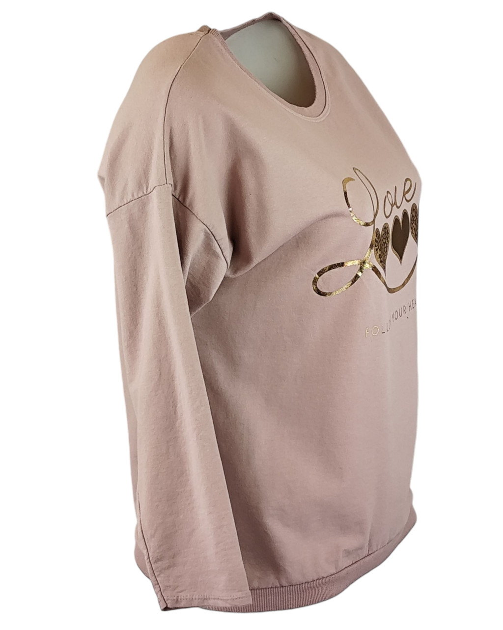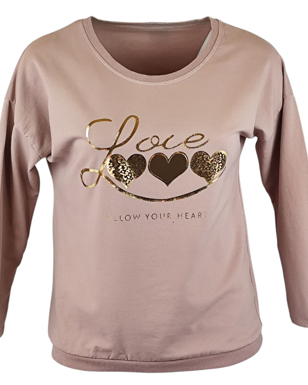 Love arany szíves feliratos fiatalos passzé aljú és ujjú pamut pulóver- púder szín
