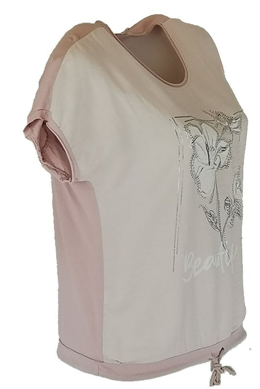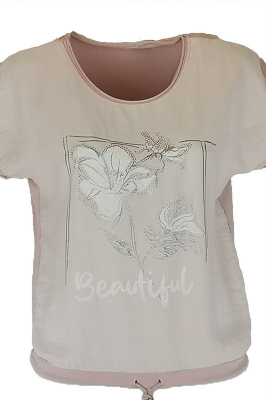 Virágos elejű felső beautiful felirattal, hátul sima egyszínű pamut anyagból készült, rövid ujjú, környakú, fiatalos olasz felsőrész, alul meghúzható zsinórral- halvány púder, fehér