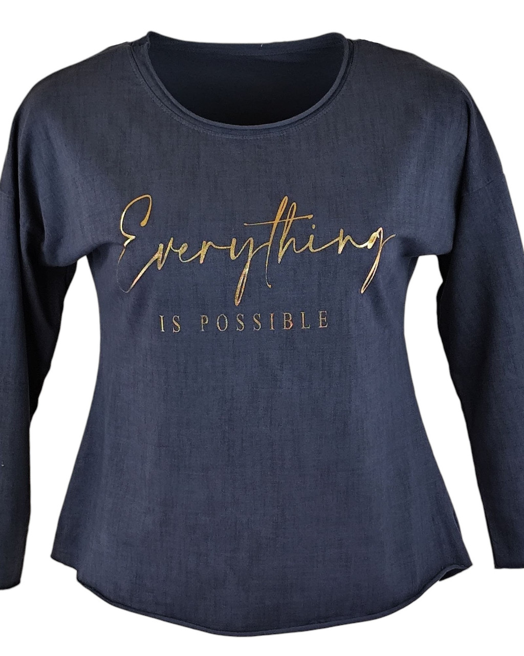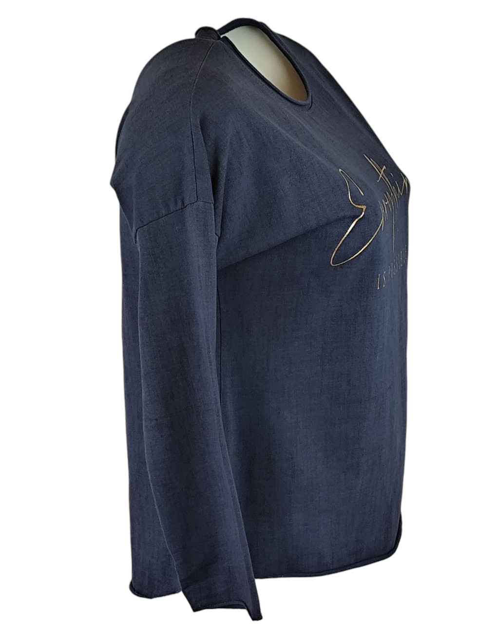 Arany feliratos elejű, hátul sima egyszínű, vastagabb pamut anyagból készült, karcsúsított, hosszú ujjú, környakú, fiatalos olasz felsőrész- sötétkék