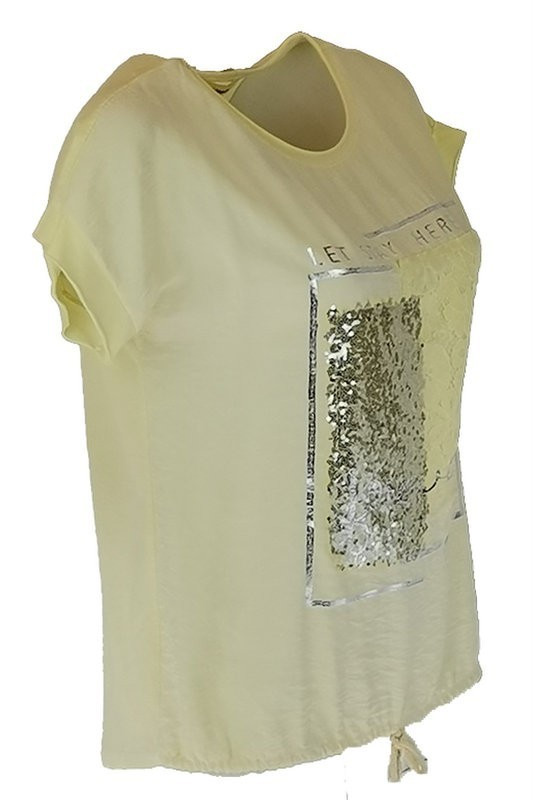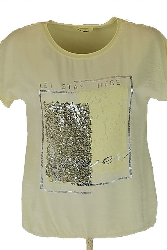 Nagy flitteres csipkés elejű ezüst feliratos, hátul sima pamut anyagból készült, rövid ujjú, környakú, olasz fiatalos felsőrész, alul meghúzható zsinórral - sárga , ezüst