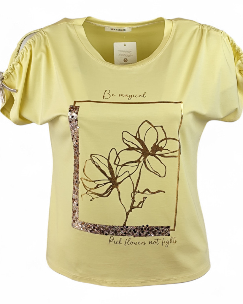 Arany négyzetben, 2 szál arany virággal díszített, viszkóz anyagból készült, lyukas vállú, rövid megkötős ujjú, fiatalos olasz felsőrész- vanília sárga, arany