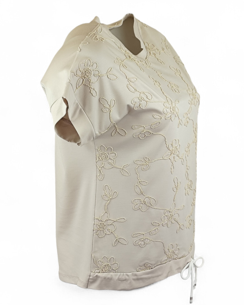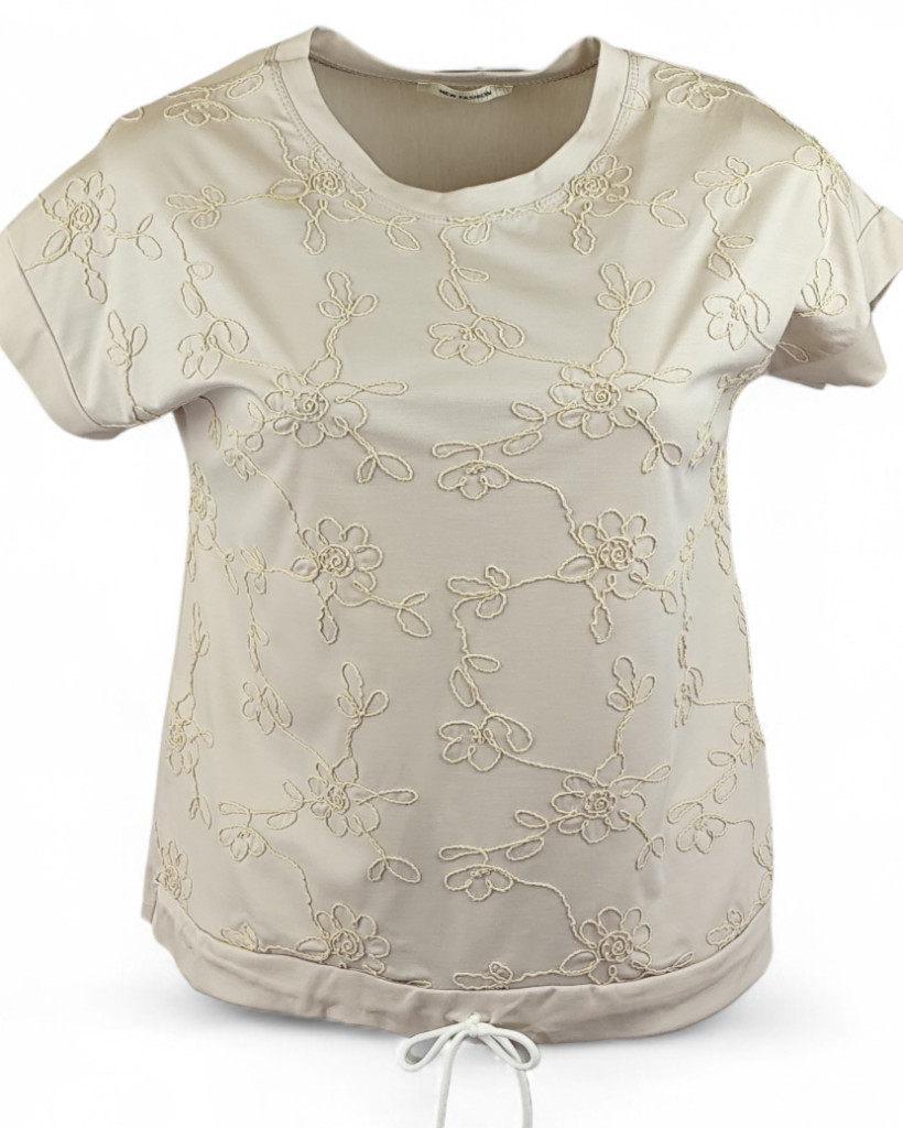Natúr madzaggal hímzett elejű, környakú, rövid ujjú, viszkóz anyagból készült, fiatalos felsőrész, húzható zsinórral az alján- drapp