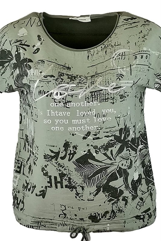 Love ezüst felirattal díszített mintás elejű, hátul sima egyszínű pamut anyagból készült, rövid ujjú, környakú, fiatalos olasz felsőrész, alul meghúzható zsinórral- keki zöld, ezüst