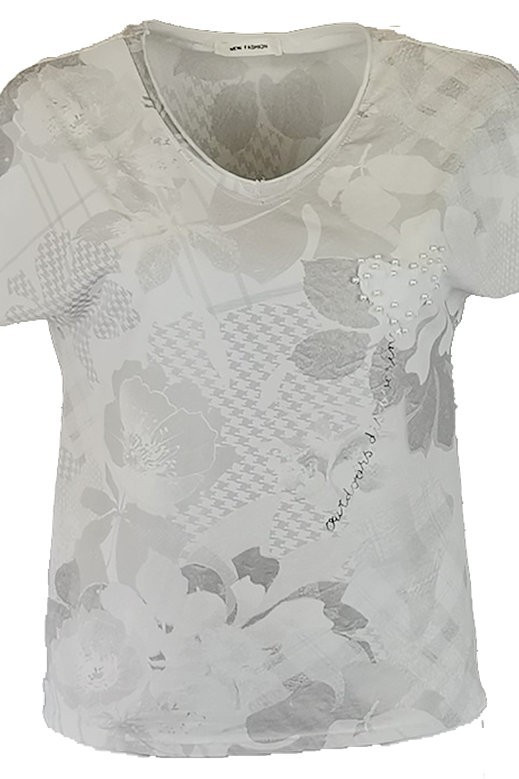 Tele mintás, V-nyakú, rövid ujjú, pamut anyagból készült fiatalos olasz felsőrész, kis gyöngyös szív díszítéssel- fehér