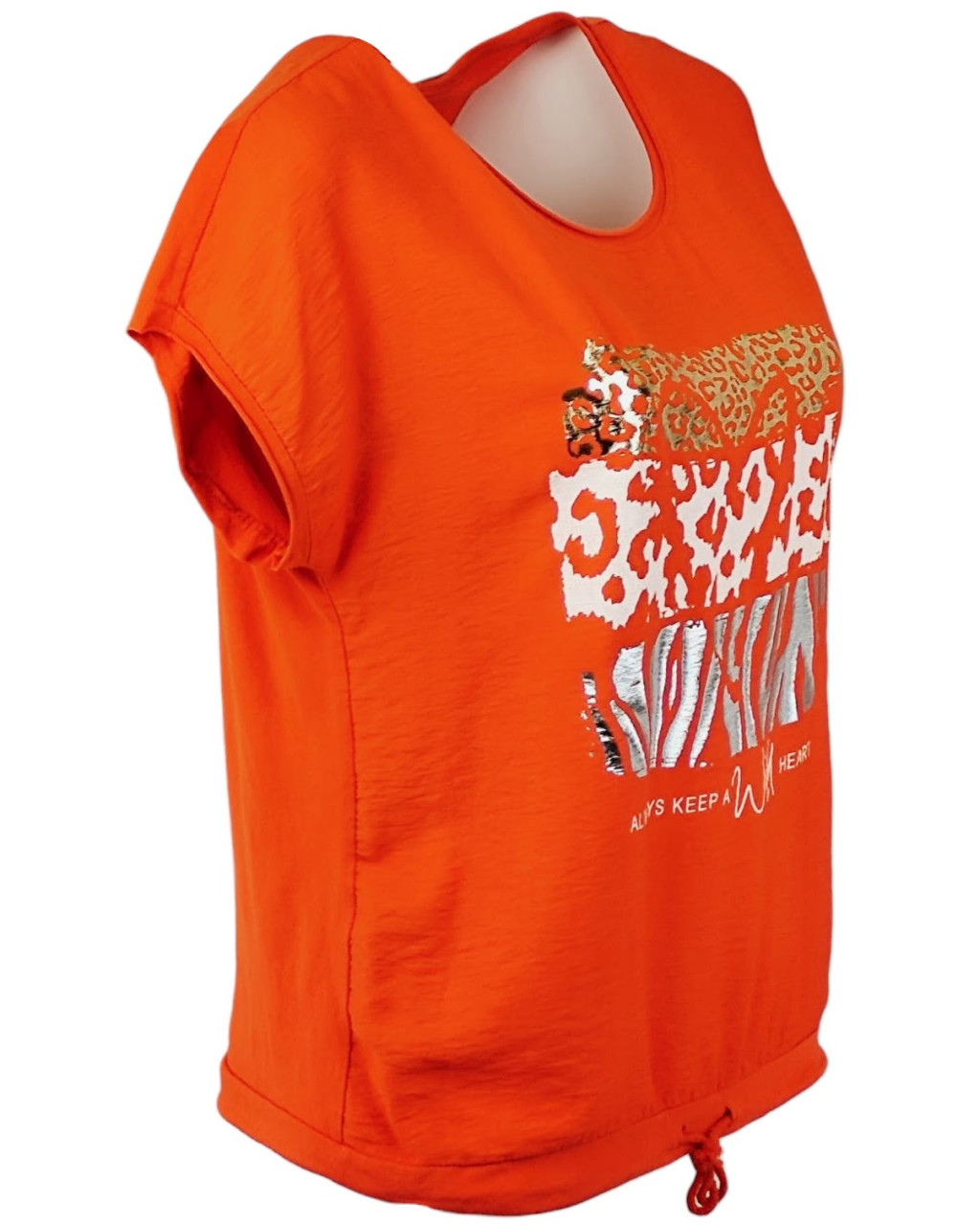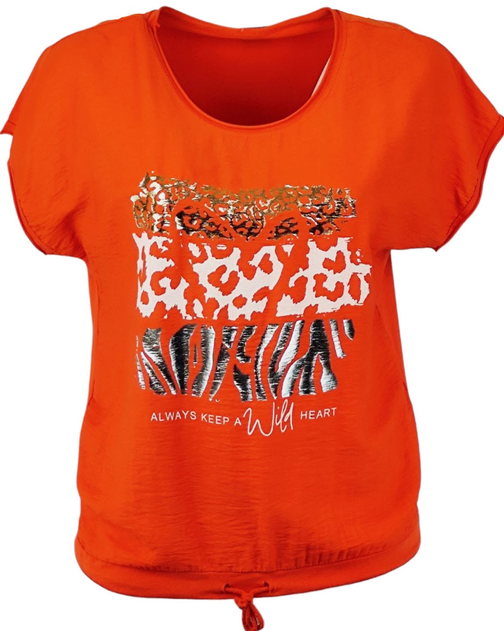 Wild heart, ocelot állat mintás, hátul sima egyszínű pamut anyagból készült, rövid ujjú, környakú, fiatalos olasz felsőrész, alul meghúzható zsinórral- narancssárga