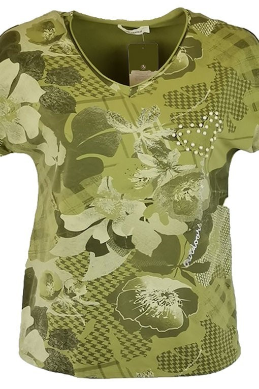 Tele mintás, V-nyakú, rövid ujjú, pamut anyagból készült fiatalos olasz felsőrész, kis gyöngyös szív díszítéssel- sárgás zöld