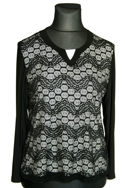 Antónia csipke elejű, fekete alkalmi lengyel felsőrész, hosszú ujjú, környakú fazon- fekete, fehér