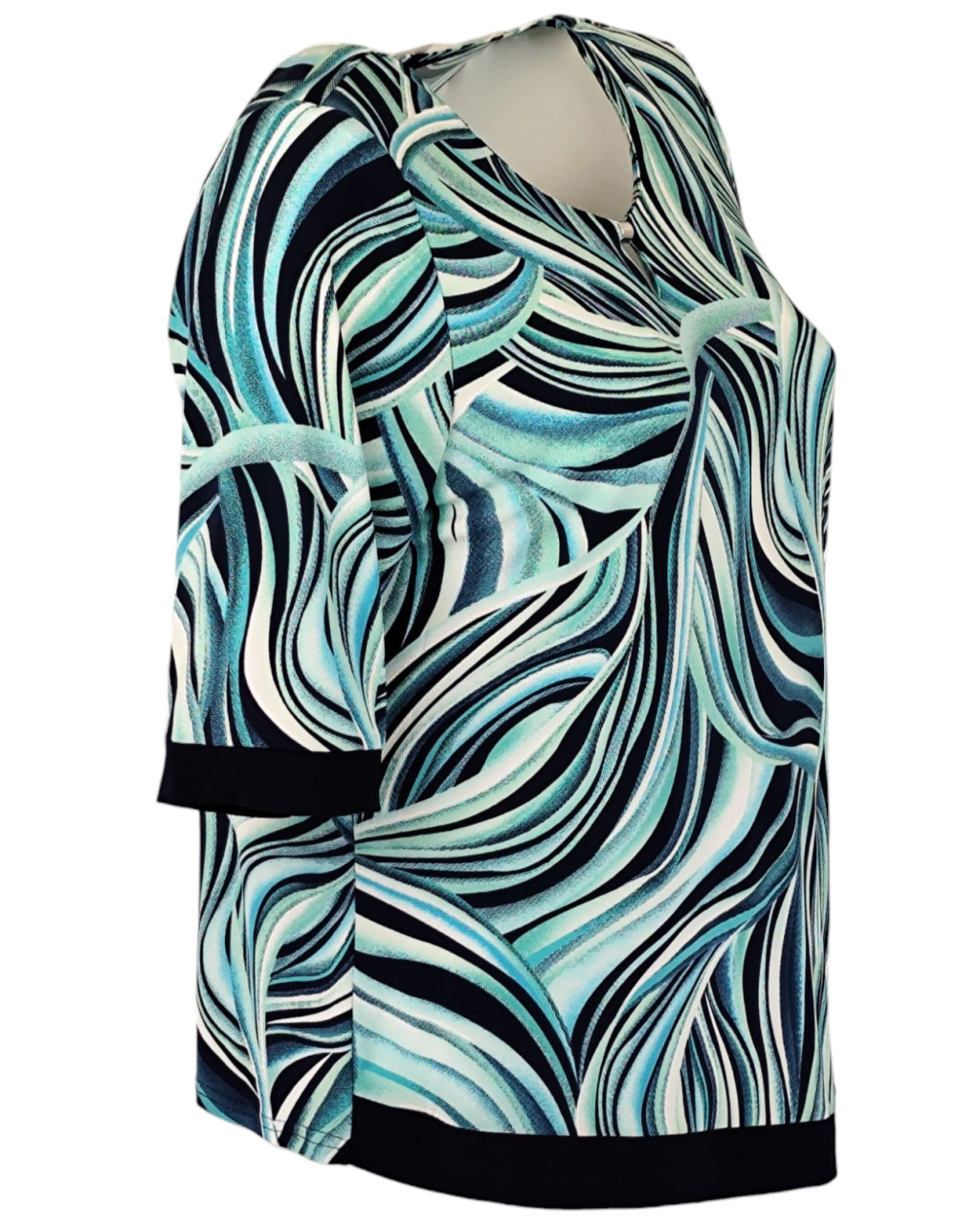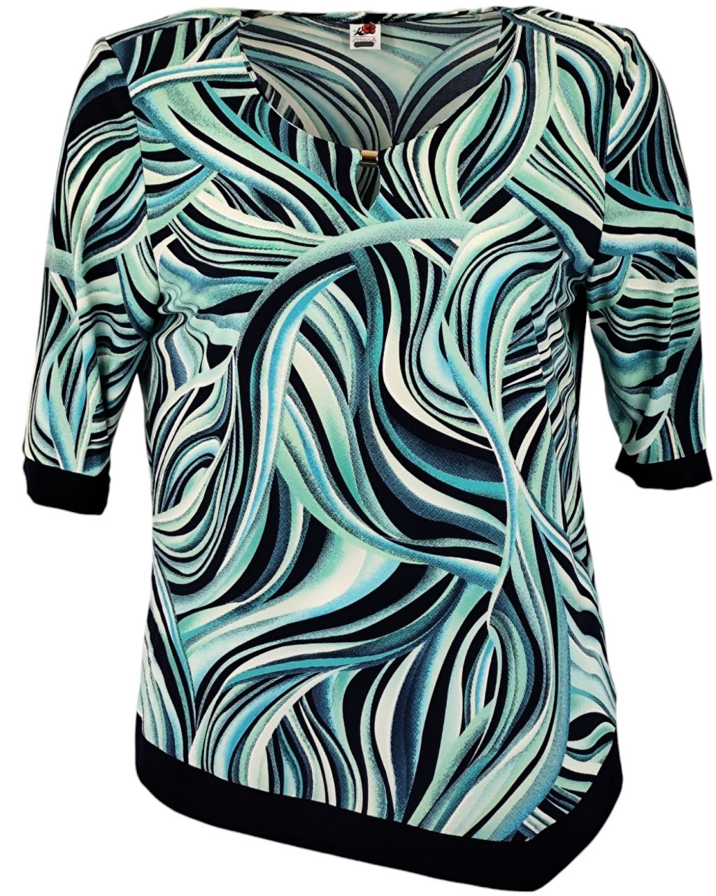 Maggi, rövidujjú, környakú, krém szín alapon levél mintás viszkóz anyagból készült, egyenes fazonú, ferde aljú, molett lengyel tunika- türkíz zöld