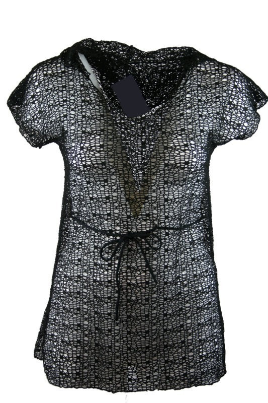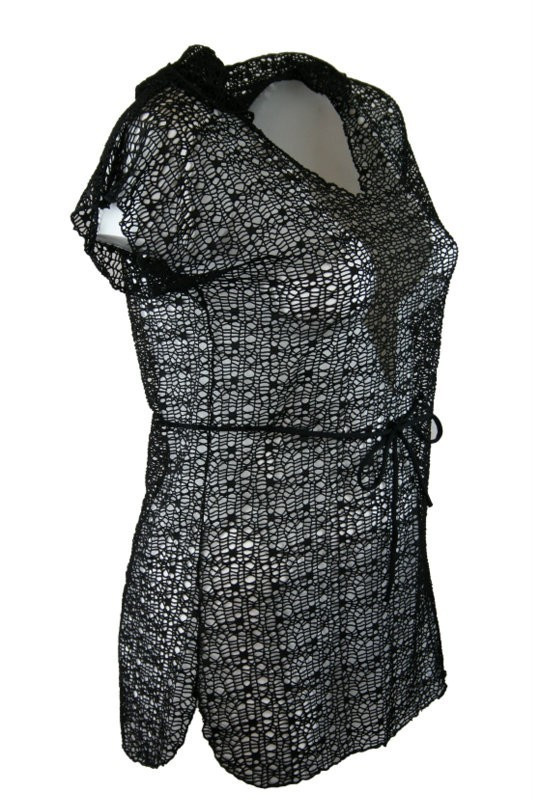 Átlátszó rövidujjú, környakú, hálós strandruha, övvel- fekete
