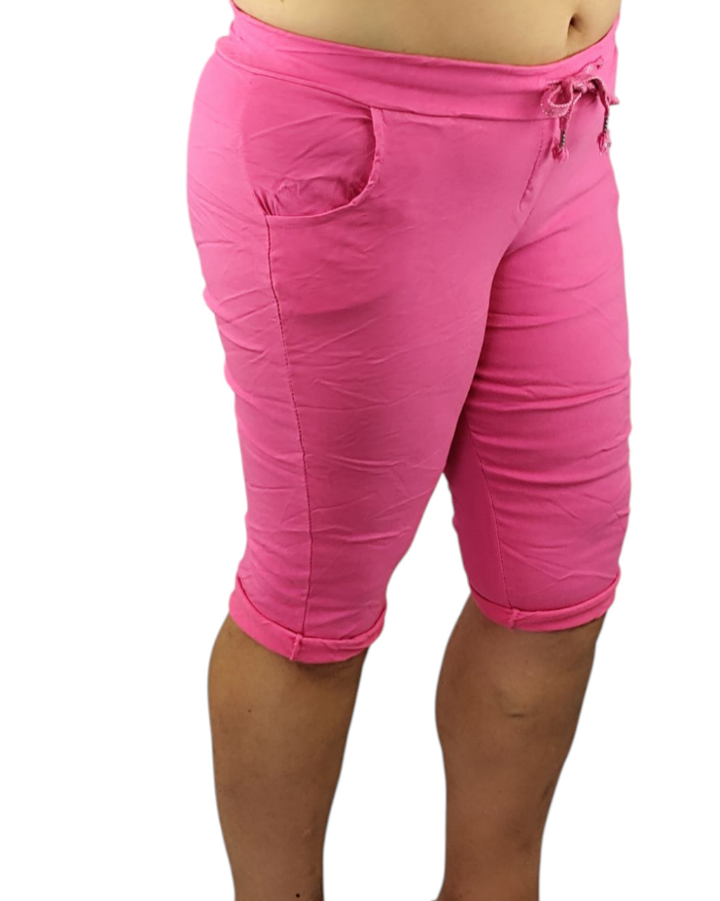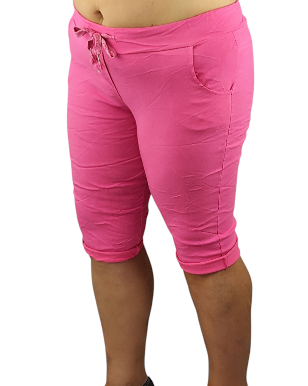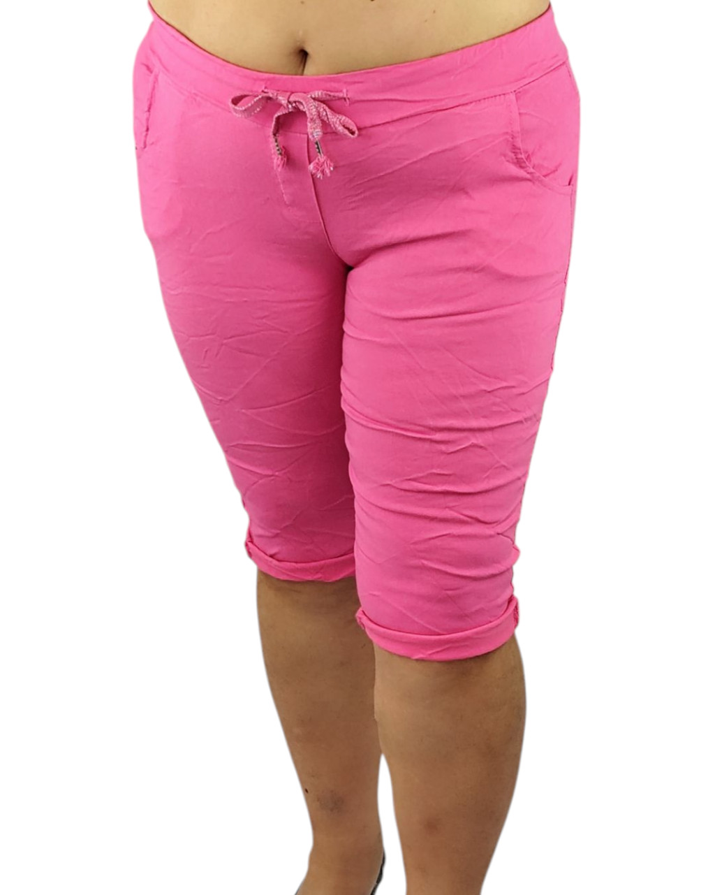 Egyszínű, térdig érő szárú, magas gumis derekú, zsebes, fiatalos olasz bermuda nyári rövid sztreccs nadrág- pink
