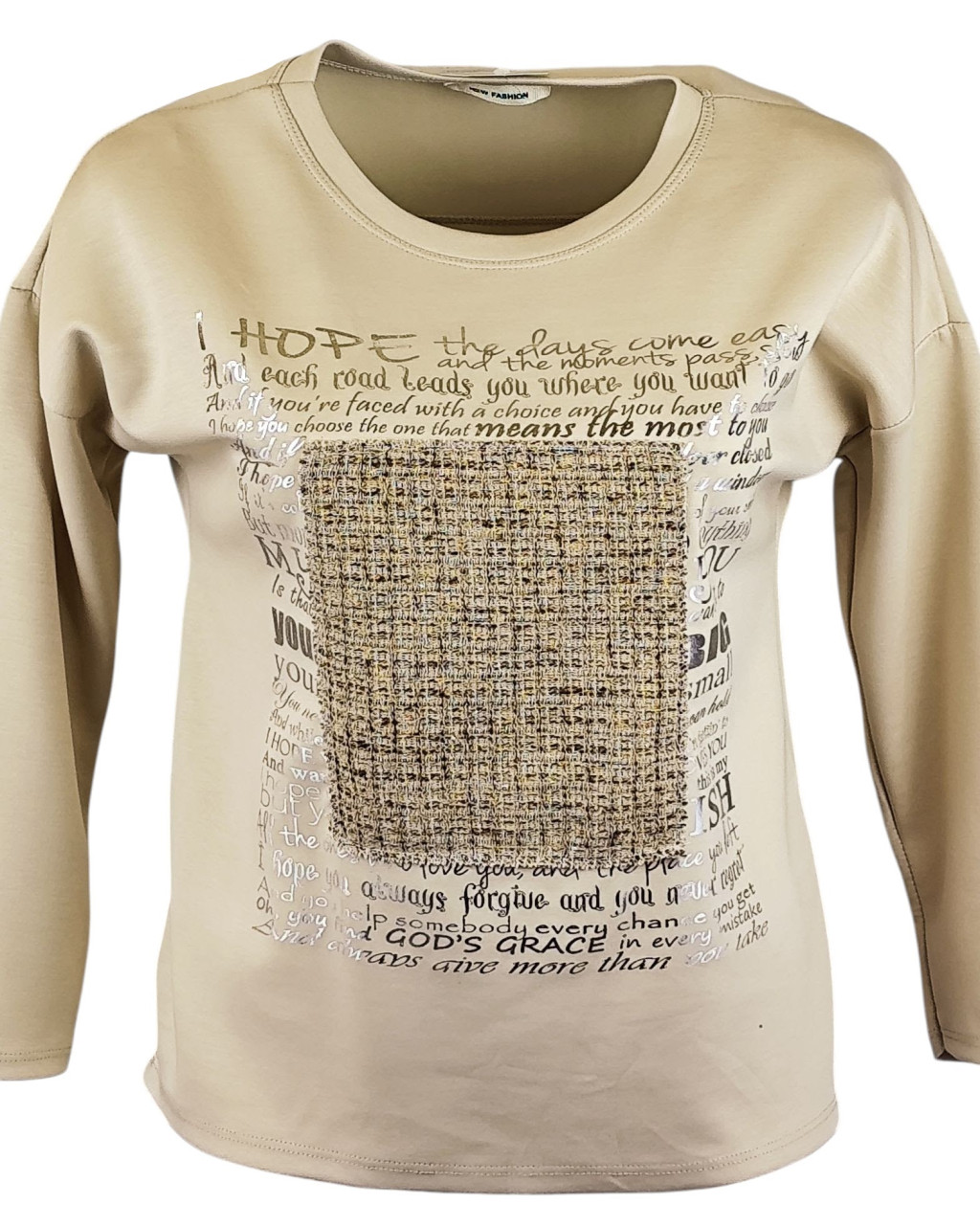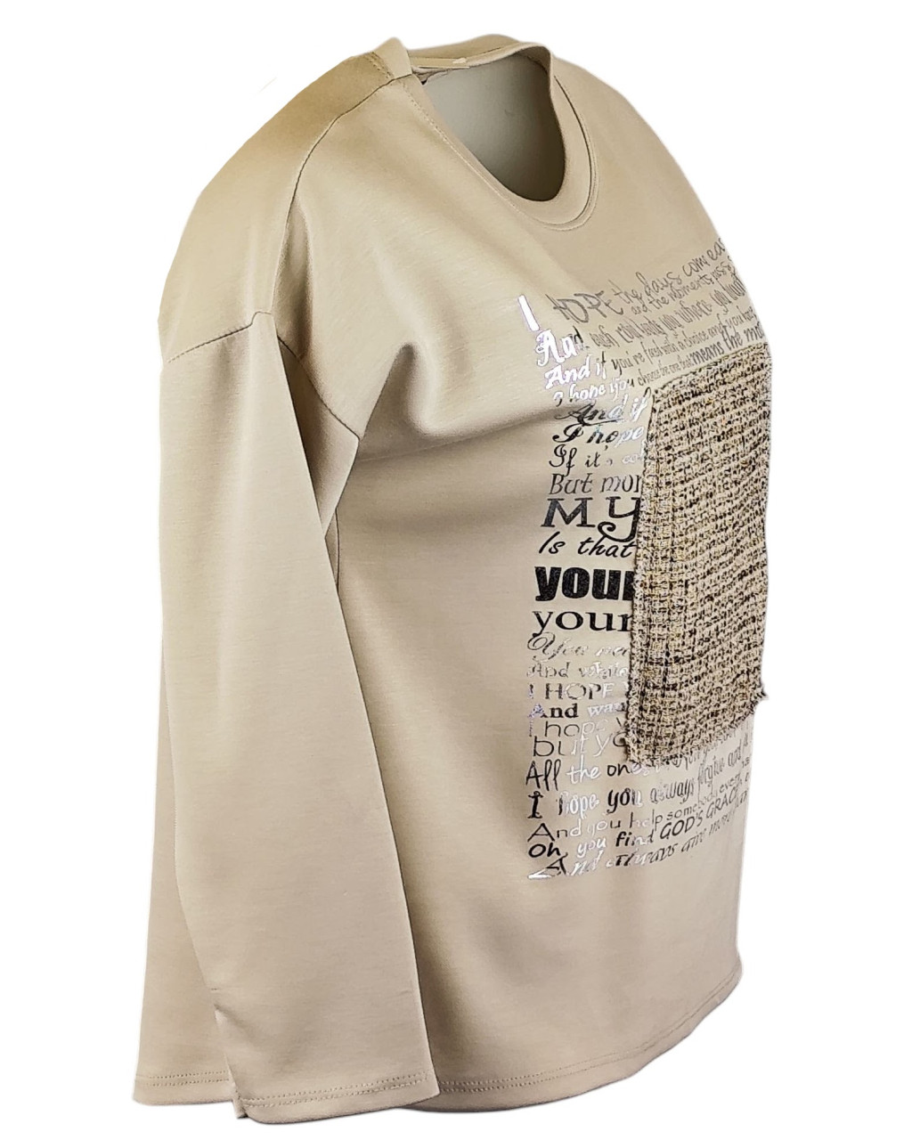 Egyszínű, vastagabb puntó anyagú, környakú, feliratos elejű, hosszú ujjú, fiatalos olasz felsőrész- drapp