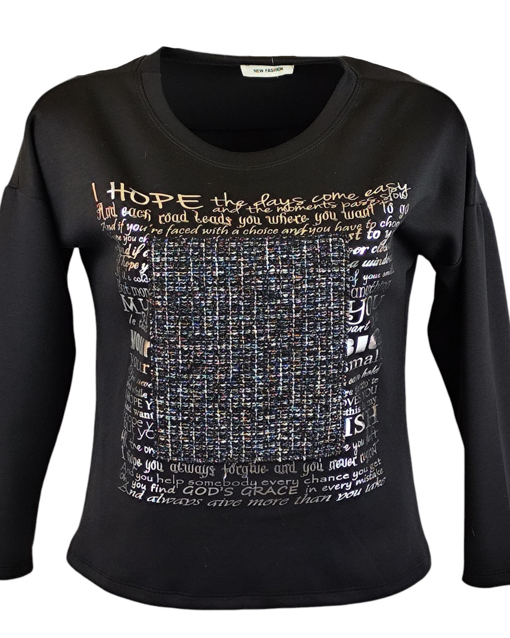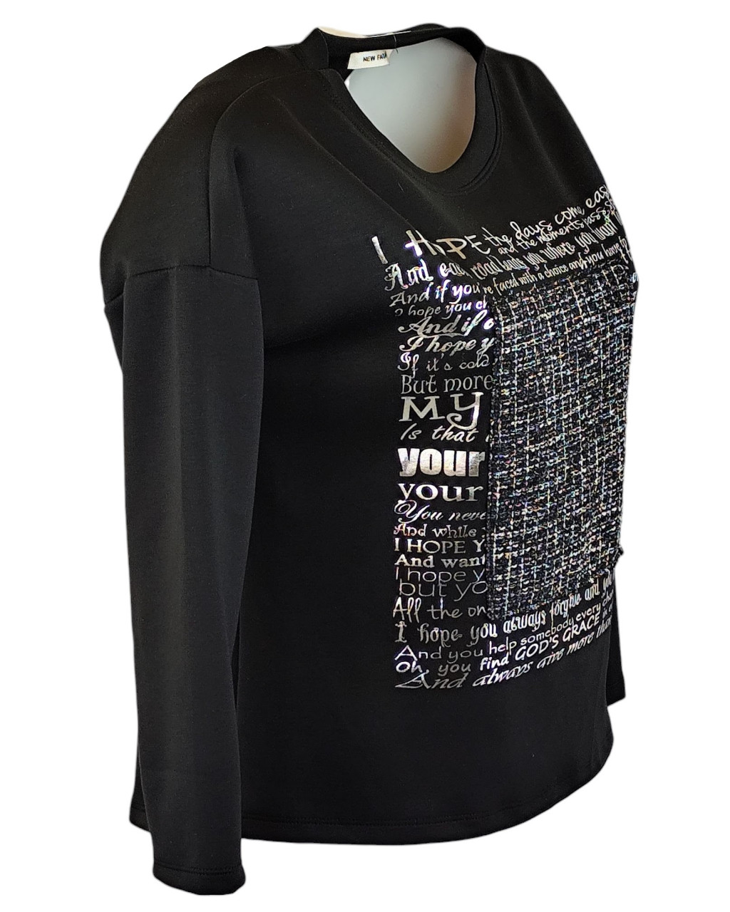 Egyszínű, vastagabb puntó anyagú, környakú, hosszú ujjú, fiatalos olasz felsőrész- fekete
