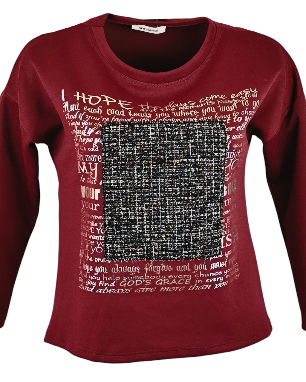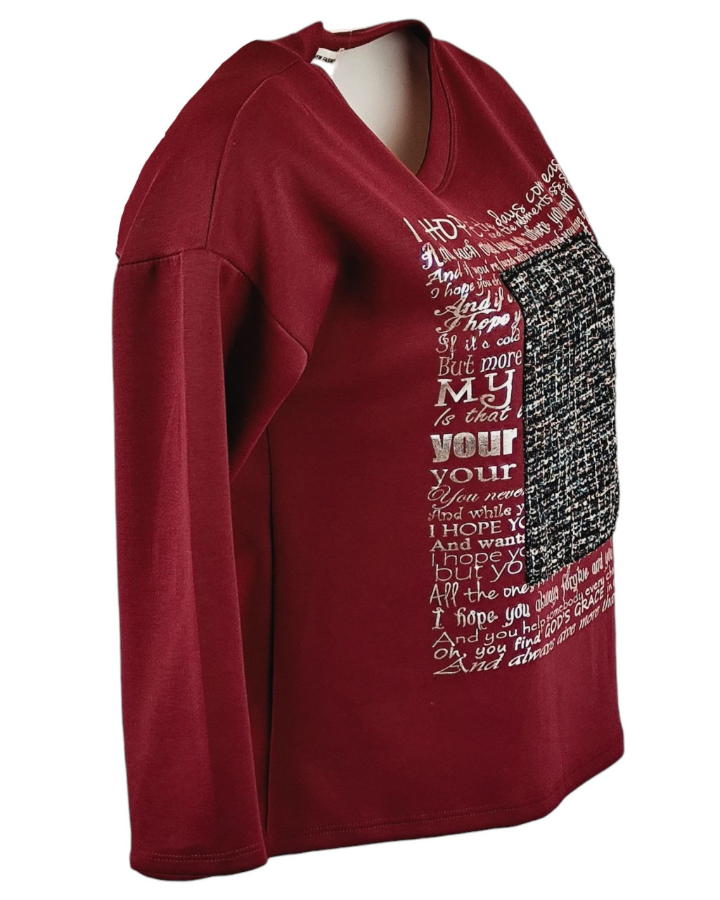 Egyszínű, vastagabb puntó anyagú, környakú, hosszú ujjú, fiatalos olasz felsőrész- bordó