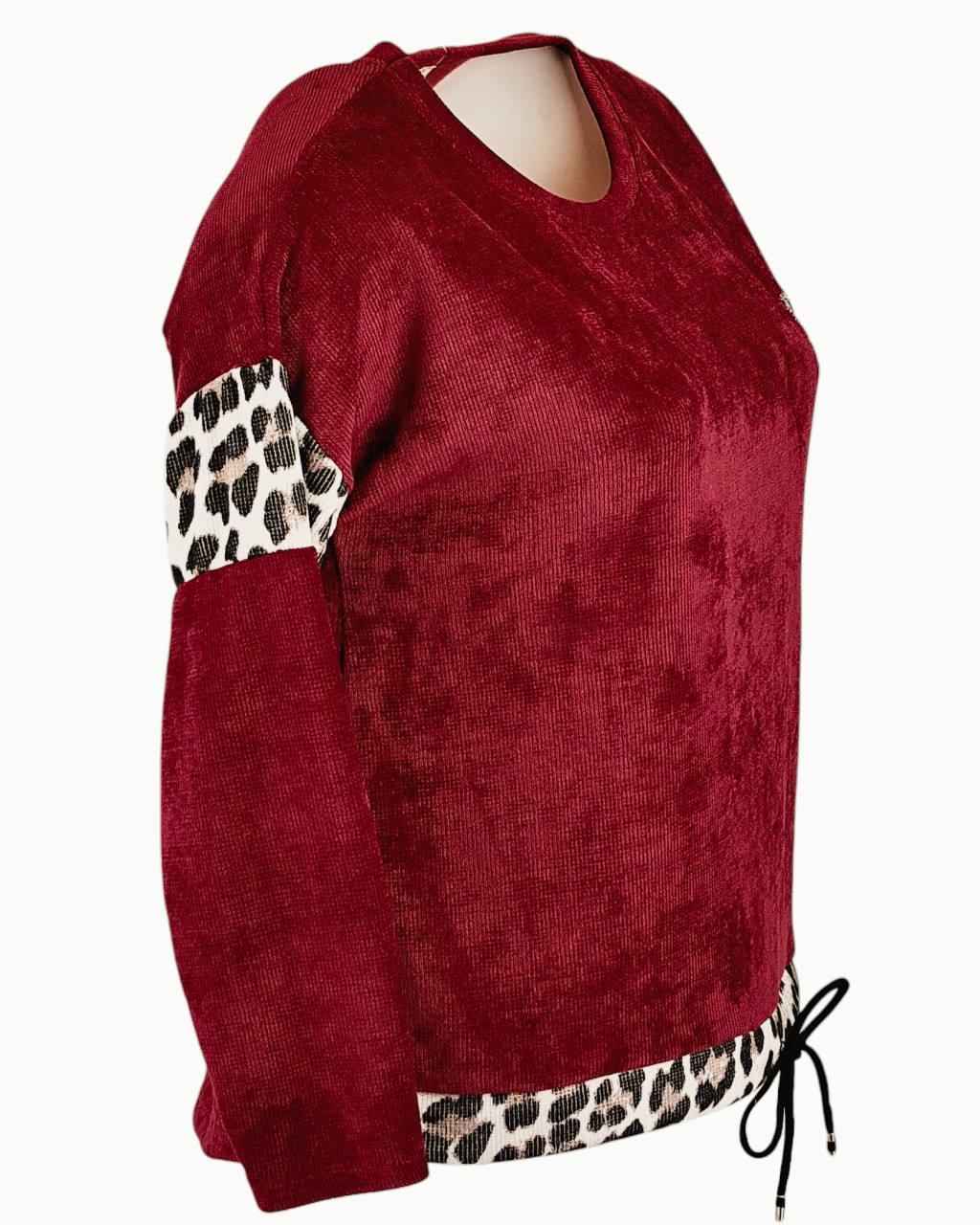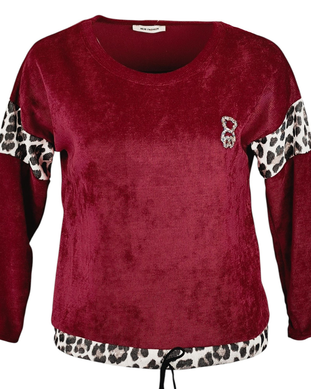 Vastag bordás anyagú, ocelot állatmintával díszített, egyszínű, hosszú ujjú, környakú, fiatalos olasz felsőrész, kis mackóval- bordó