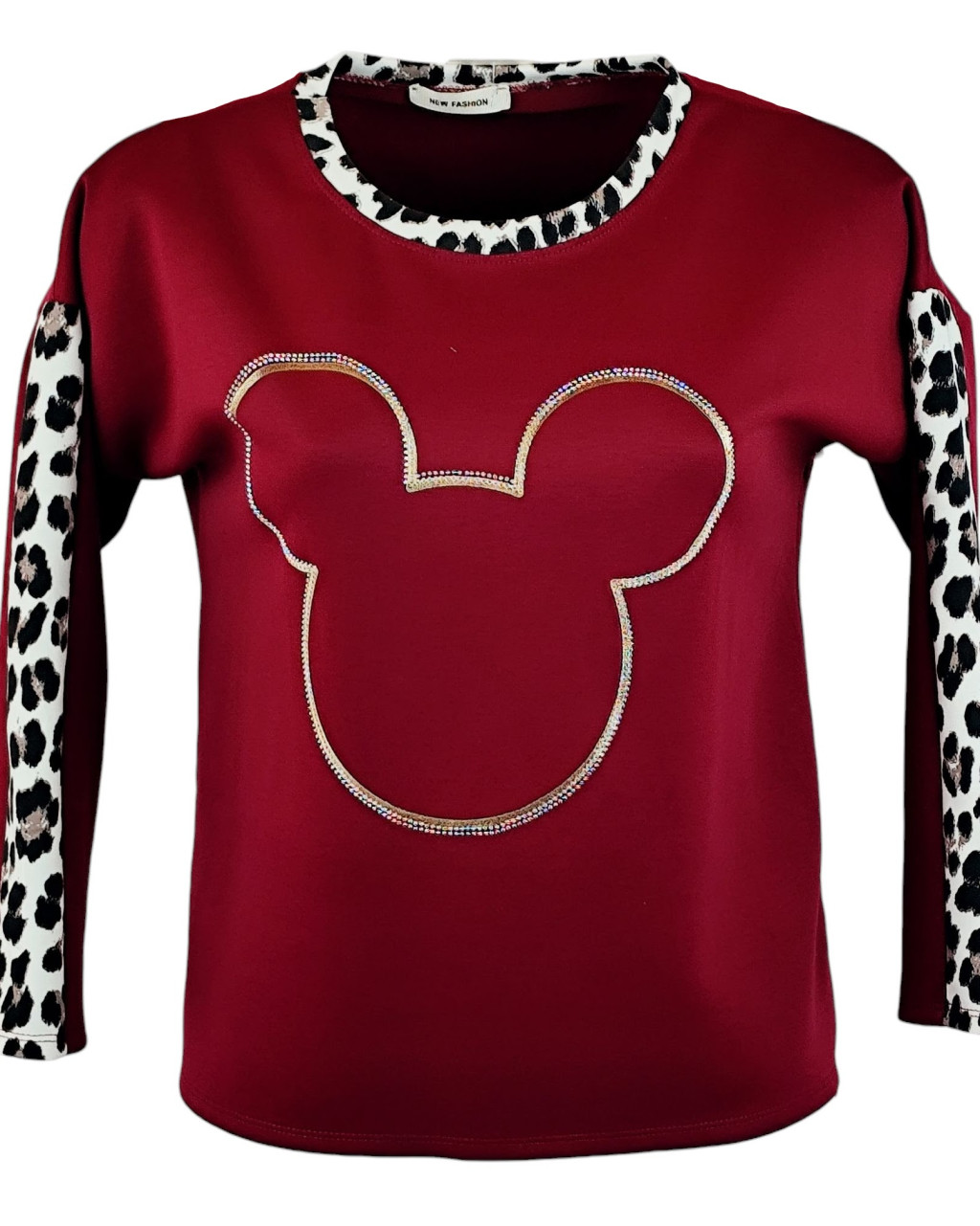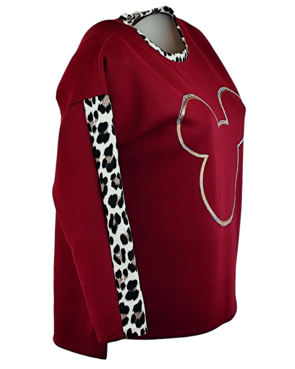 Ocelot állat mintás, micky egér fejes, vastagabb puntó anyagú, környakú, hosszú ujjú, fiatalos olasz felsőrész- bordó