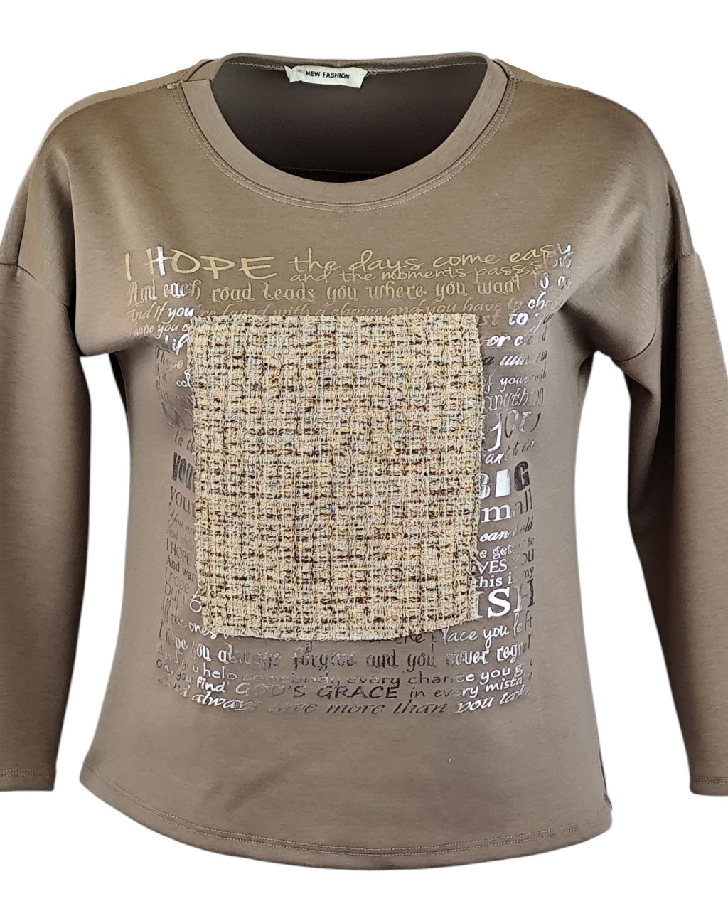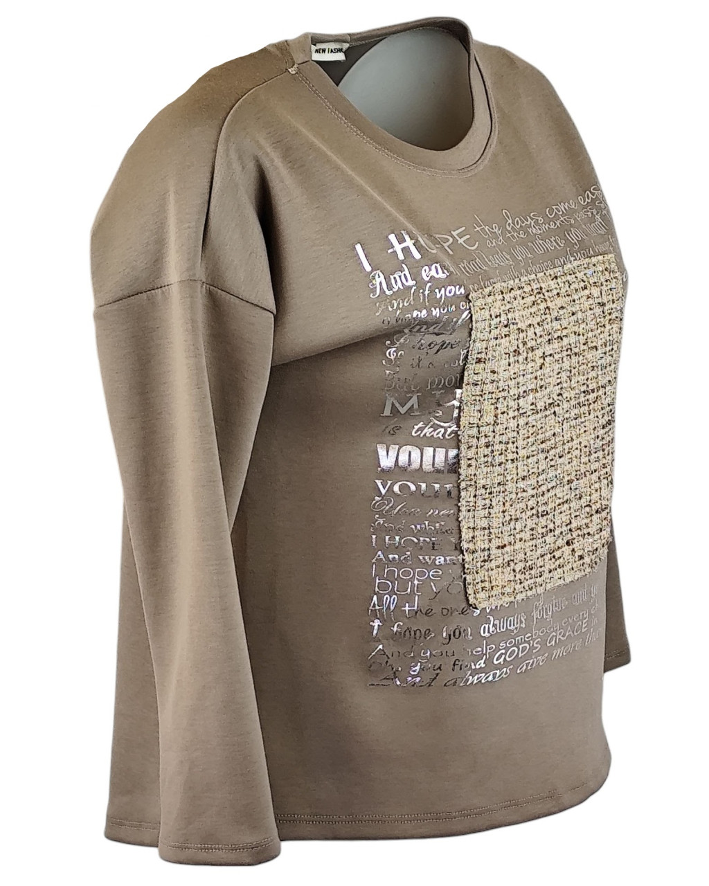 Egyszínű, vastagabb puntó anyagú, környakú, hosszú ujjú, fiatalos olasz felsőrész- mogyoró barna