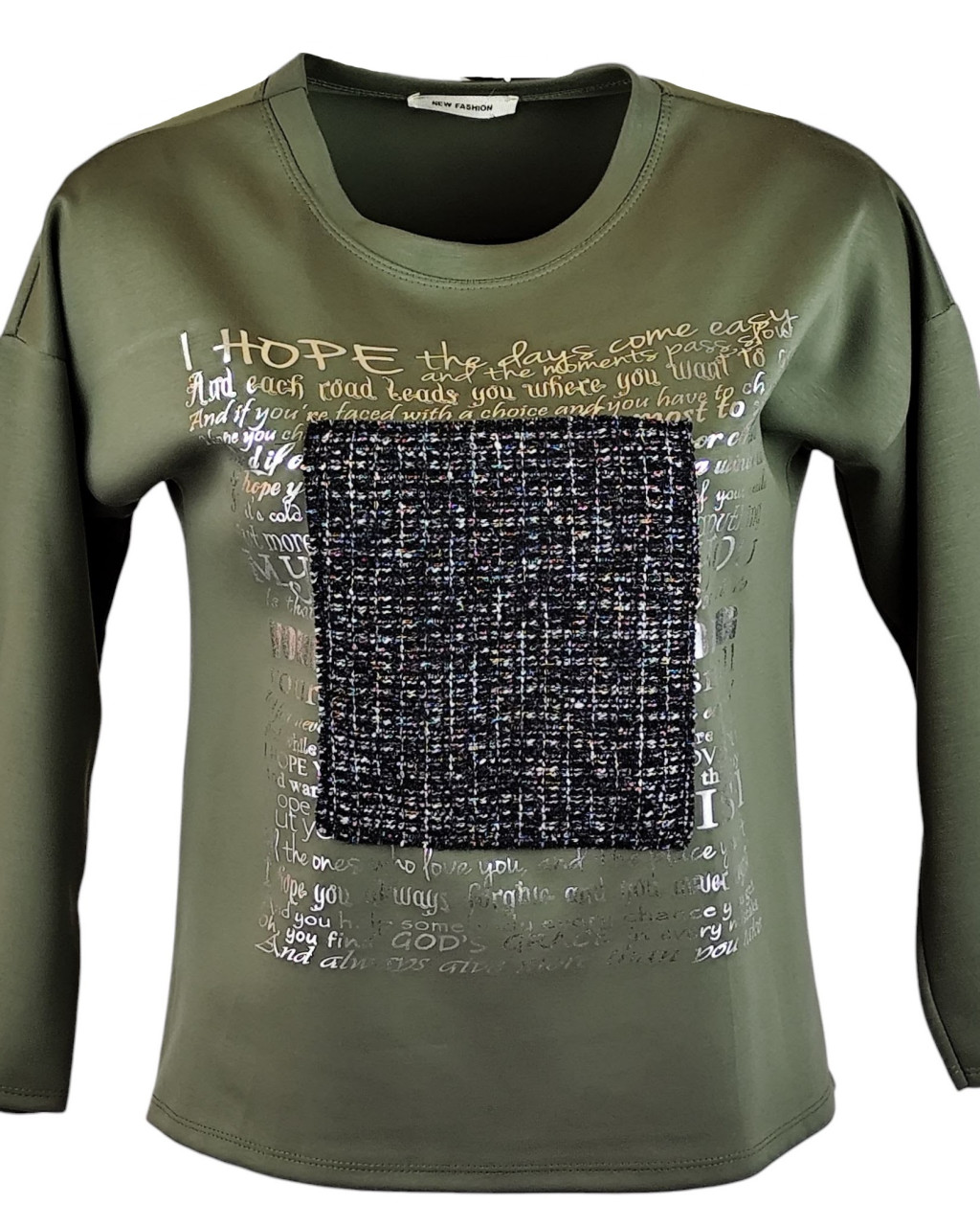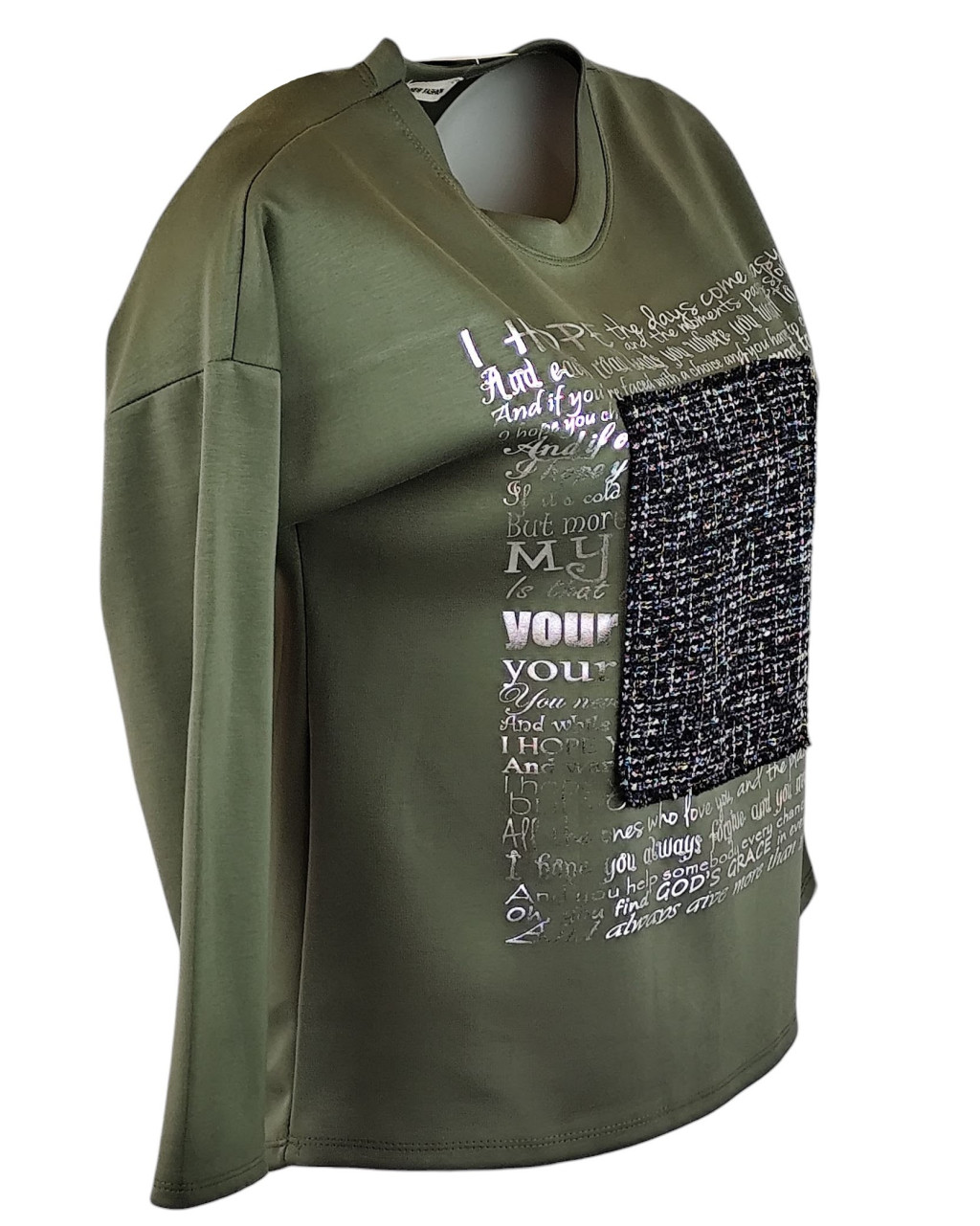 Egyszínű, vastagabb puntó anyagú, környakú, hosszú ujjú, fiatalos olasz felsőrész- keki zöld