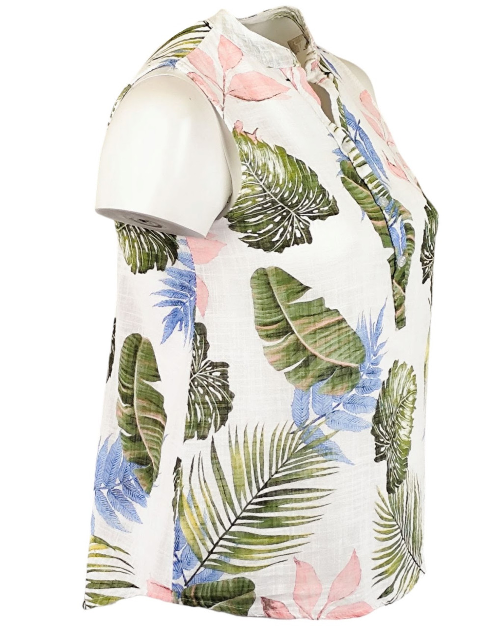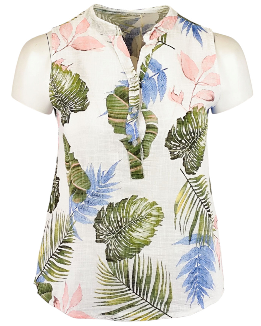 Levél mintás, ujjatlan, nyitott nyakú, félig gombos, rövidebb egyenes fazonú, fiatalos olasz géz ingblúz kis zsebbel- fehér, zöld