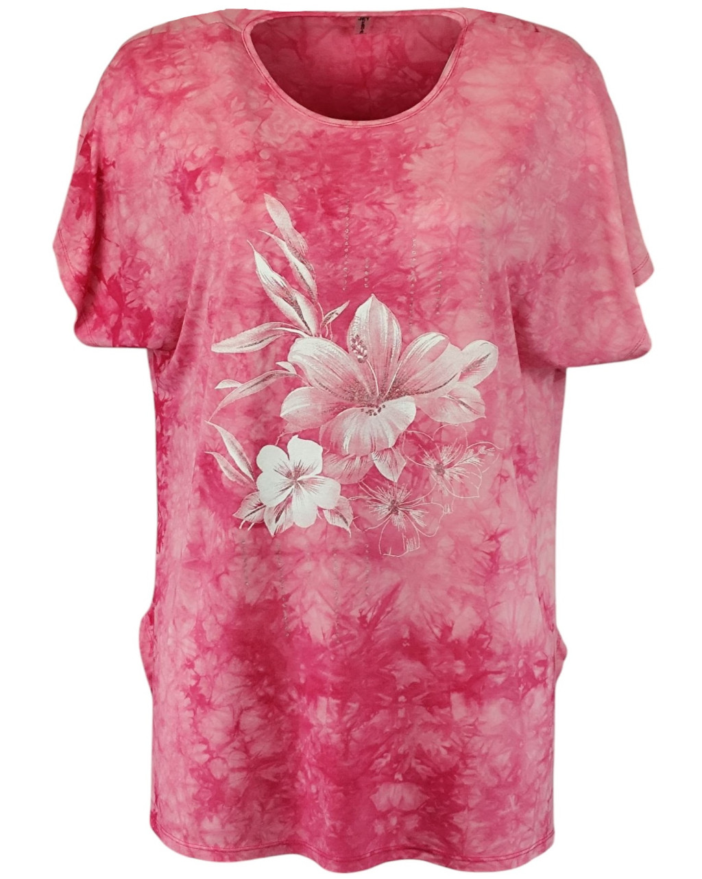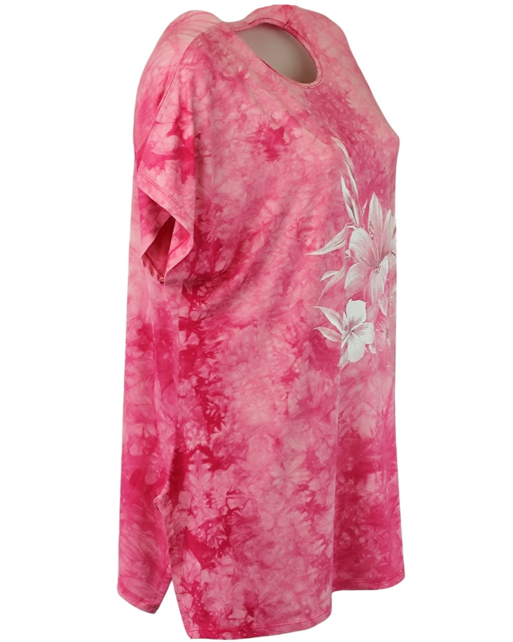 Lily batikolt pamut anyagú, rövidujjú, környakú, hosszított fazonú, "A"- vonalú, molett pamut török tunika, fehér virág mintával az elején- pink