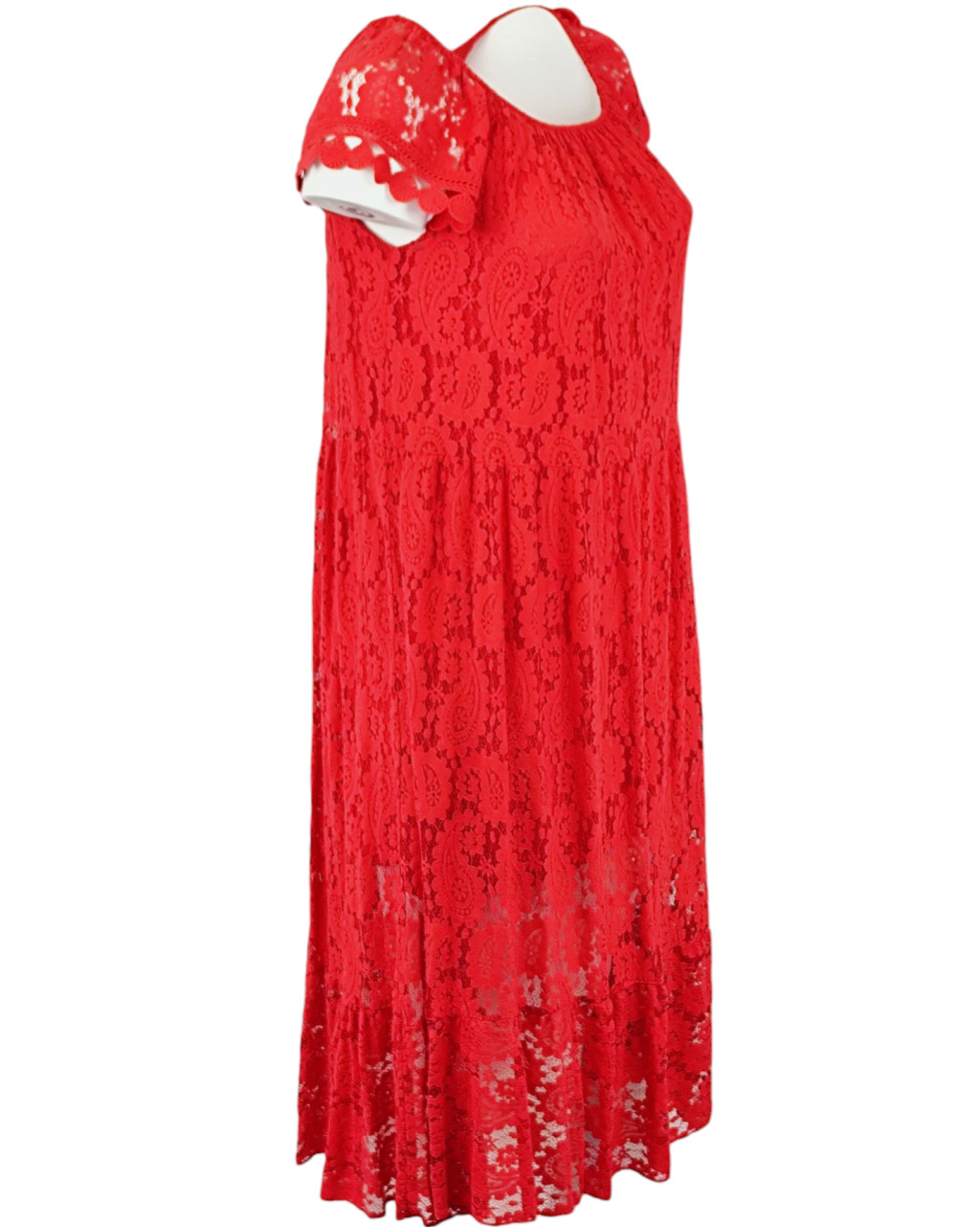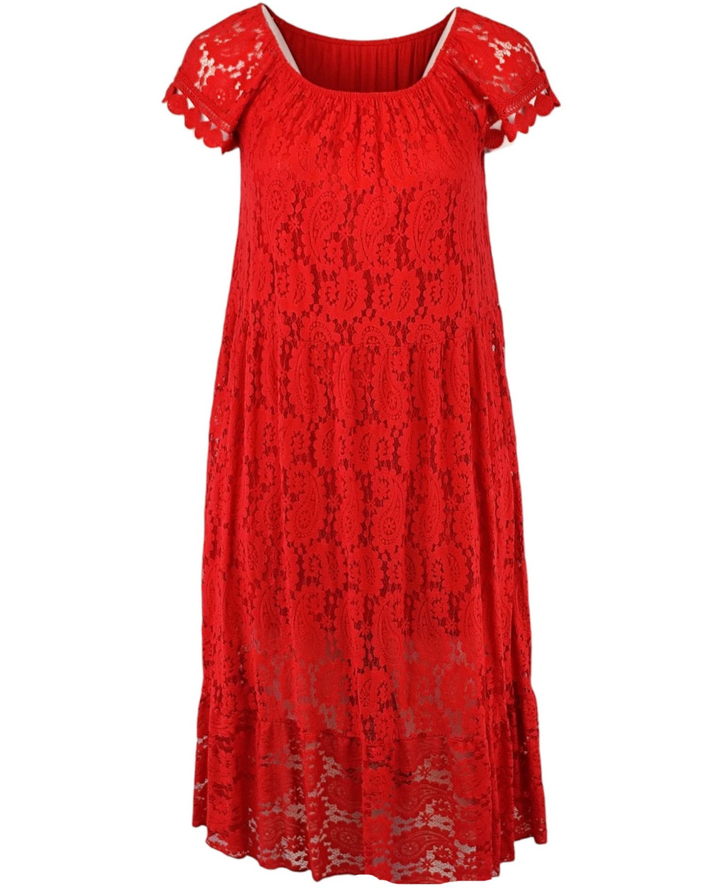 Tiszta csipke hosszú ruha, lefelé bővülő fazonú, gumírozott vállra húzható, környakú alkalmi olasz csipke ruha, pamut béléssel- piros