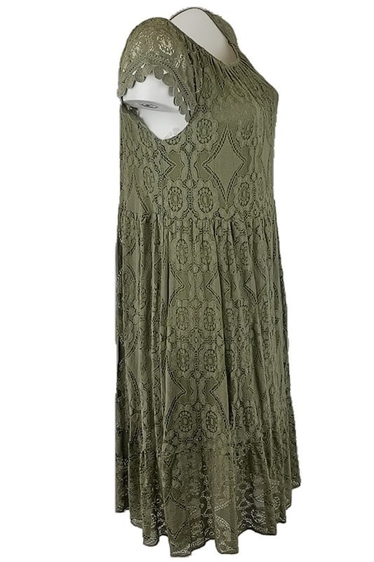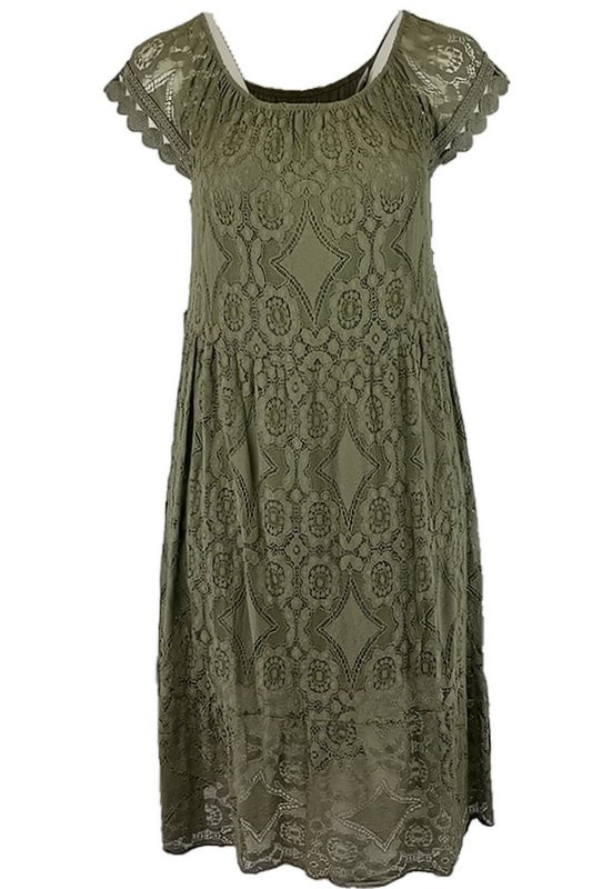 Tiszta csipke hosszú ruha, lefelé bővülő fazonú, gumírozott vállra húzható, környakú alkalmi olasz csipke ruha, pamut béléssel- keki zöld
