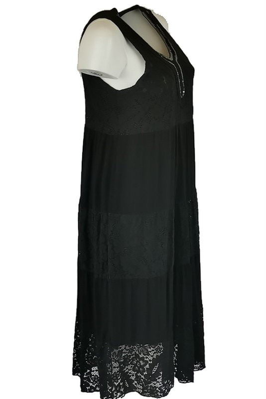 Flitteres csipkés V-nyakú, ujjatlan dupla csipke-selyem-pamut alkalmi olasz ruha- fekete