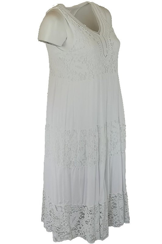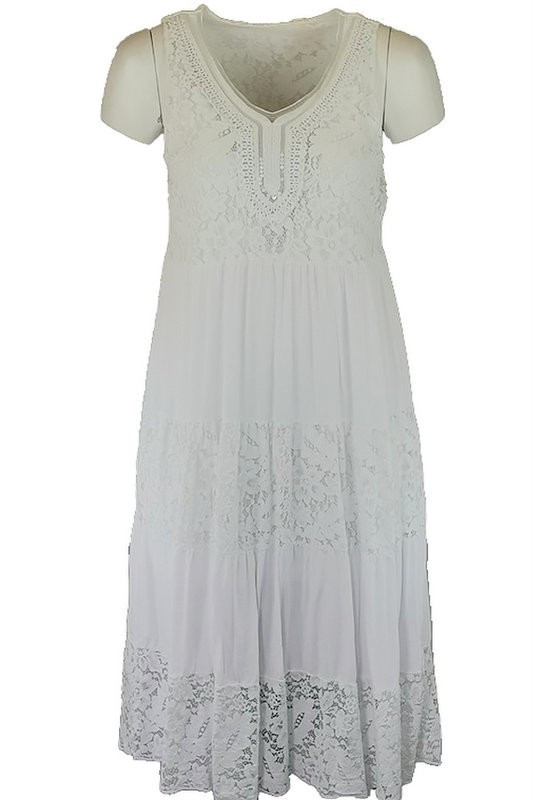 Flitteres csipkés V-nyakú, ujjatlan dupla csipke-selyem-pamut alkalmi olasz ruha- fehér