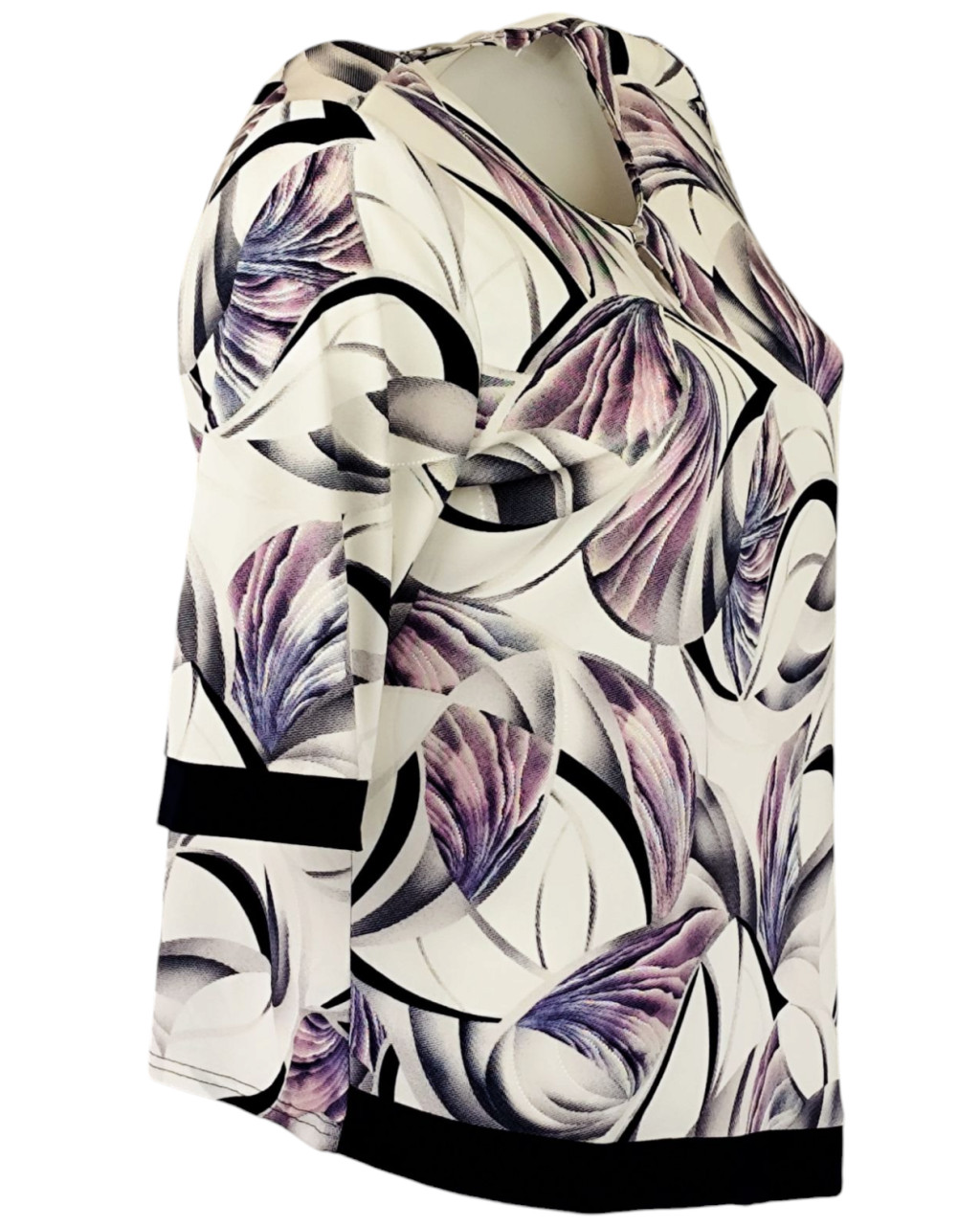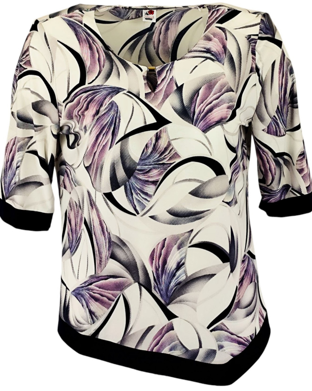 Maggi, rövidujjú, környakú, krém szín alapon levél mintás viszkóz anyagból készült, egyenes fazonú, ferde aljú, molett lengyel tunika- krém szín, világos lila
