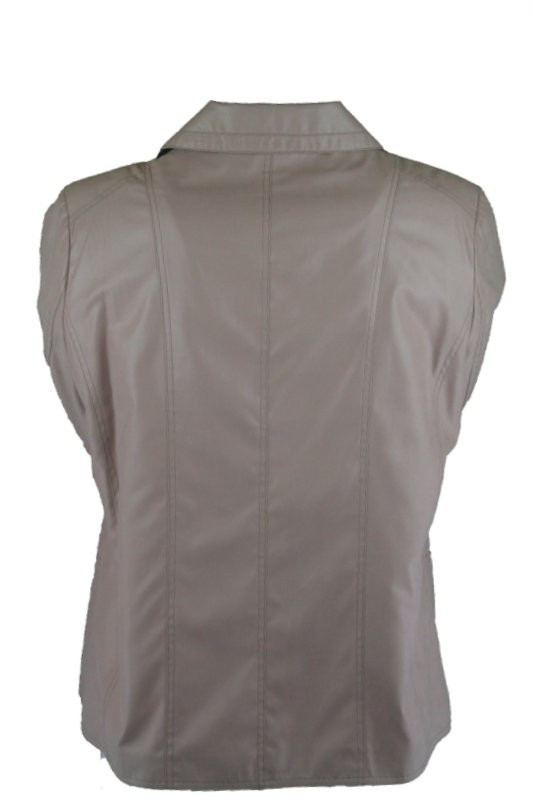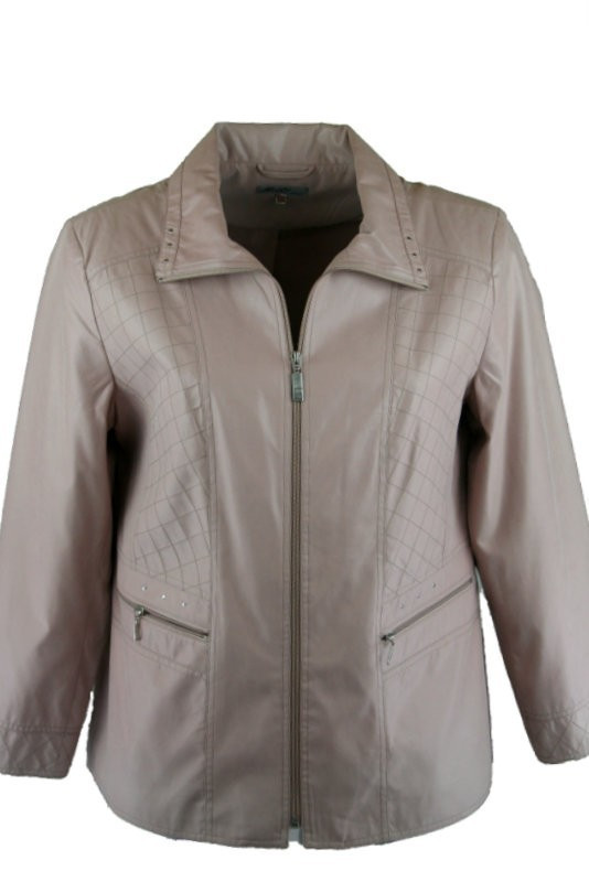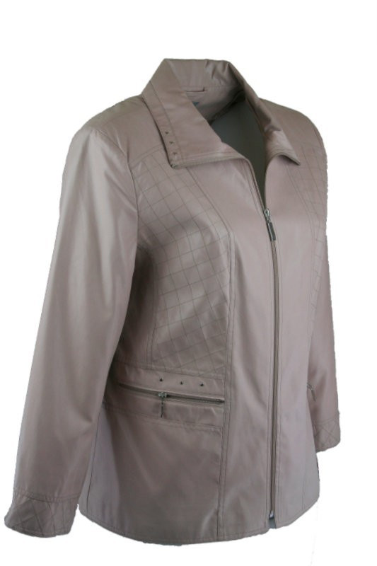 Galléros, környakú, cipzáros, egyenes fazonú, csinos, béléses bőrhatású szövet anyagába hímzett rombuszminta díszítéssel készült blézer, ferde cipzáros zsebekkel- púder szín