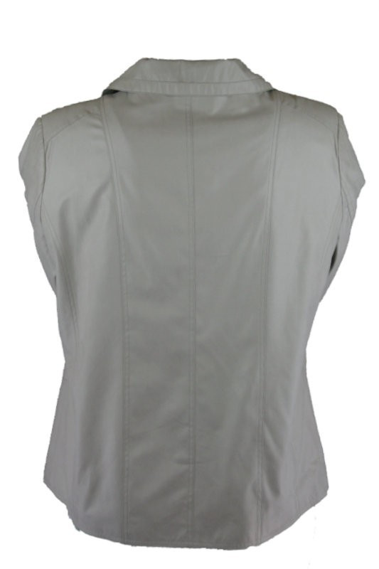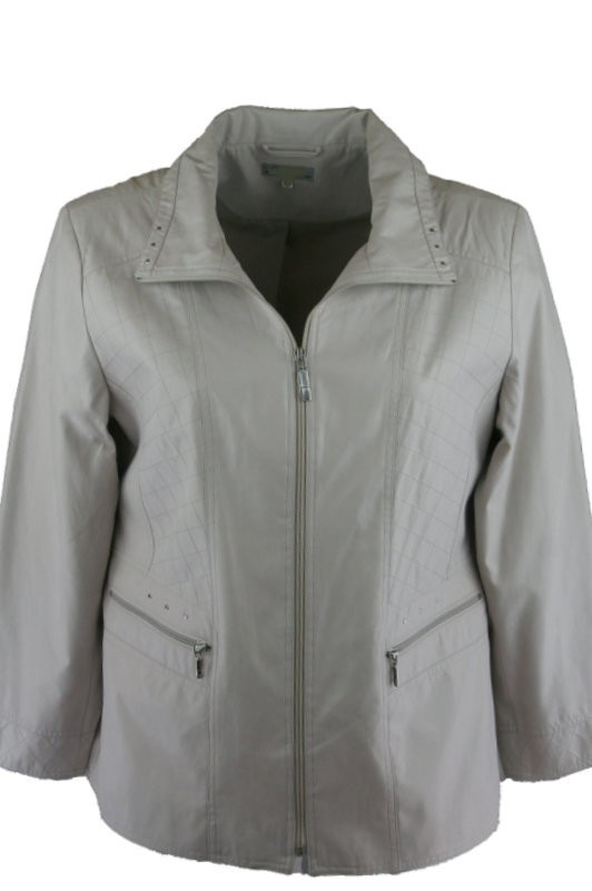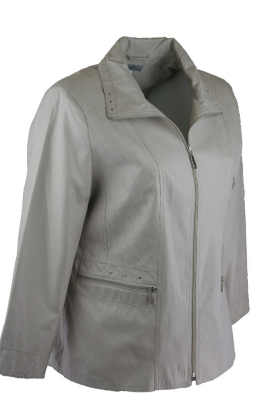 Galléros, környakú, cipzáros, egyenes fazonú, csinos, béléses bőrhatású szövet anyagába hímzett rombuszminta díszítéssel készült blézer, ferde cipzáros zsebekkel- drapp