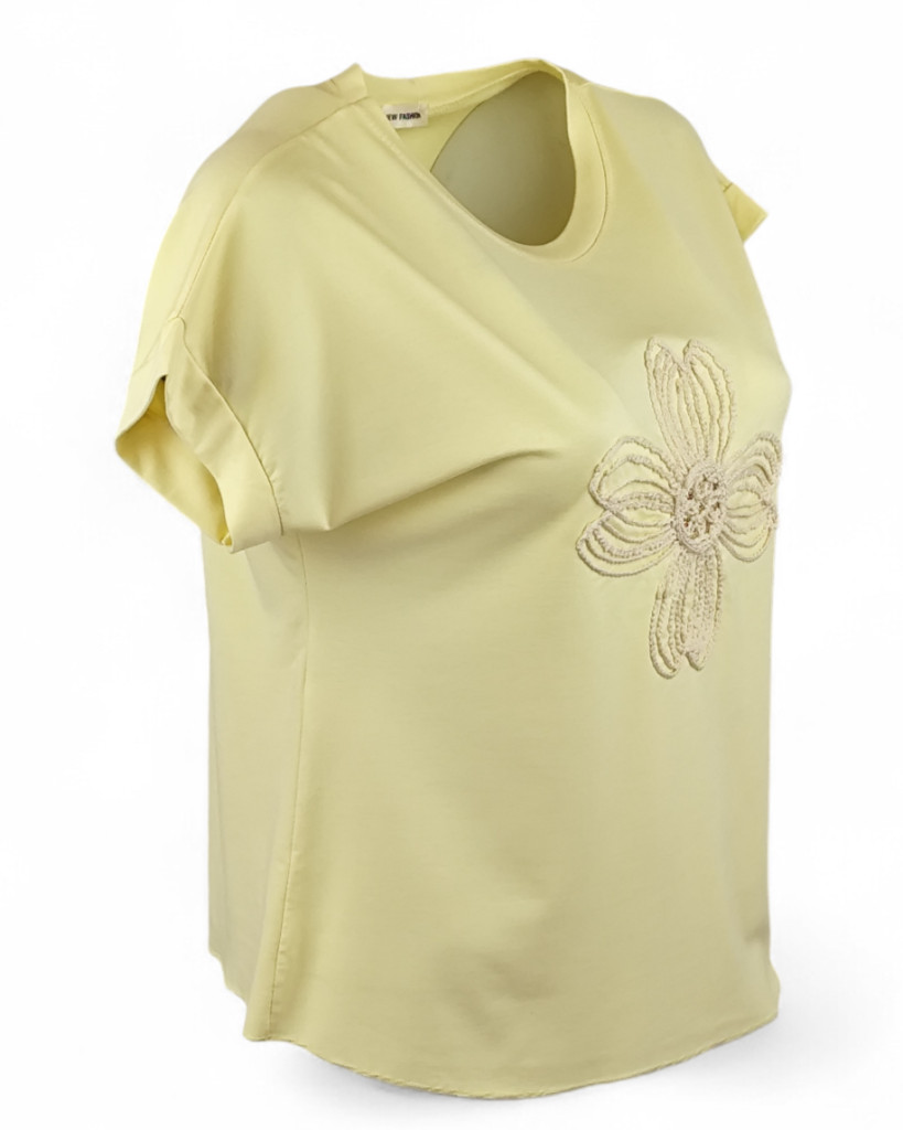 Natúr madzaggal hímzett virágfejjel díszített, környakú, rövid ujjú, viszkóz anyagból készült, oldalt kötős, fiatalos felsőrész- vanília sárga