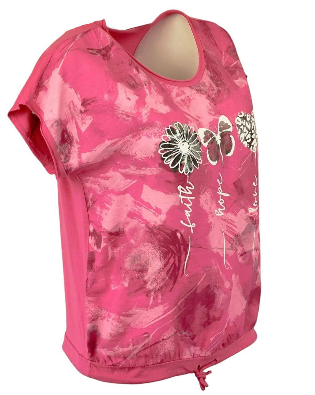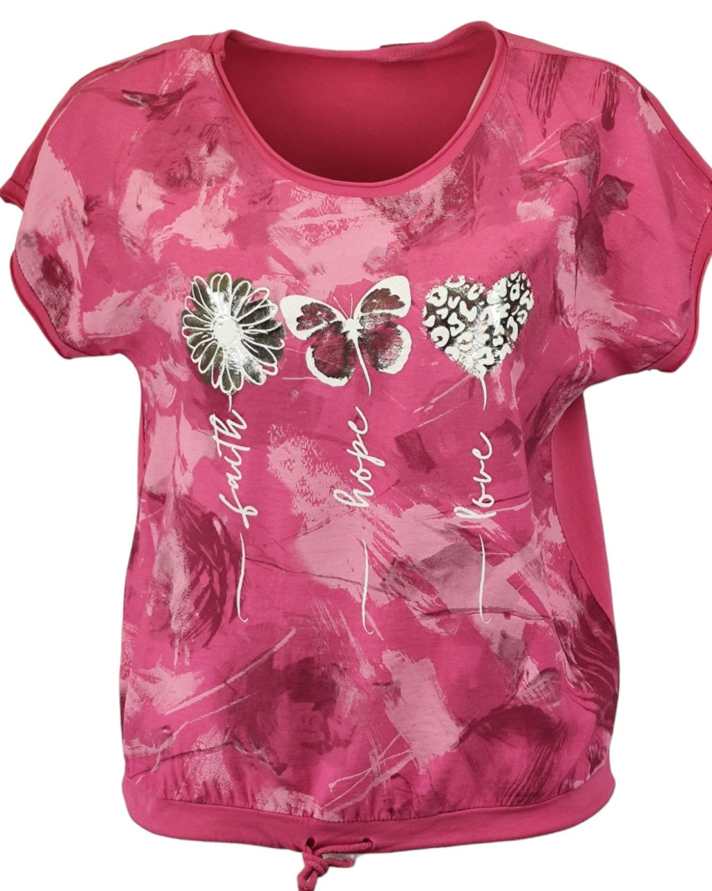 Batikolt elejű felső 3 kis mintával az elején, hátul sima egyszínű pamut anyagból készült, rövid ujjú, környakú, fiatalos olasz felsőrész, alul meghúzható zsinórral- pink