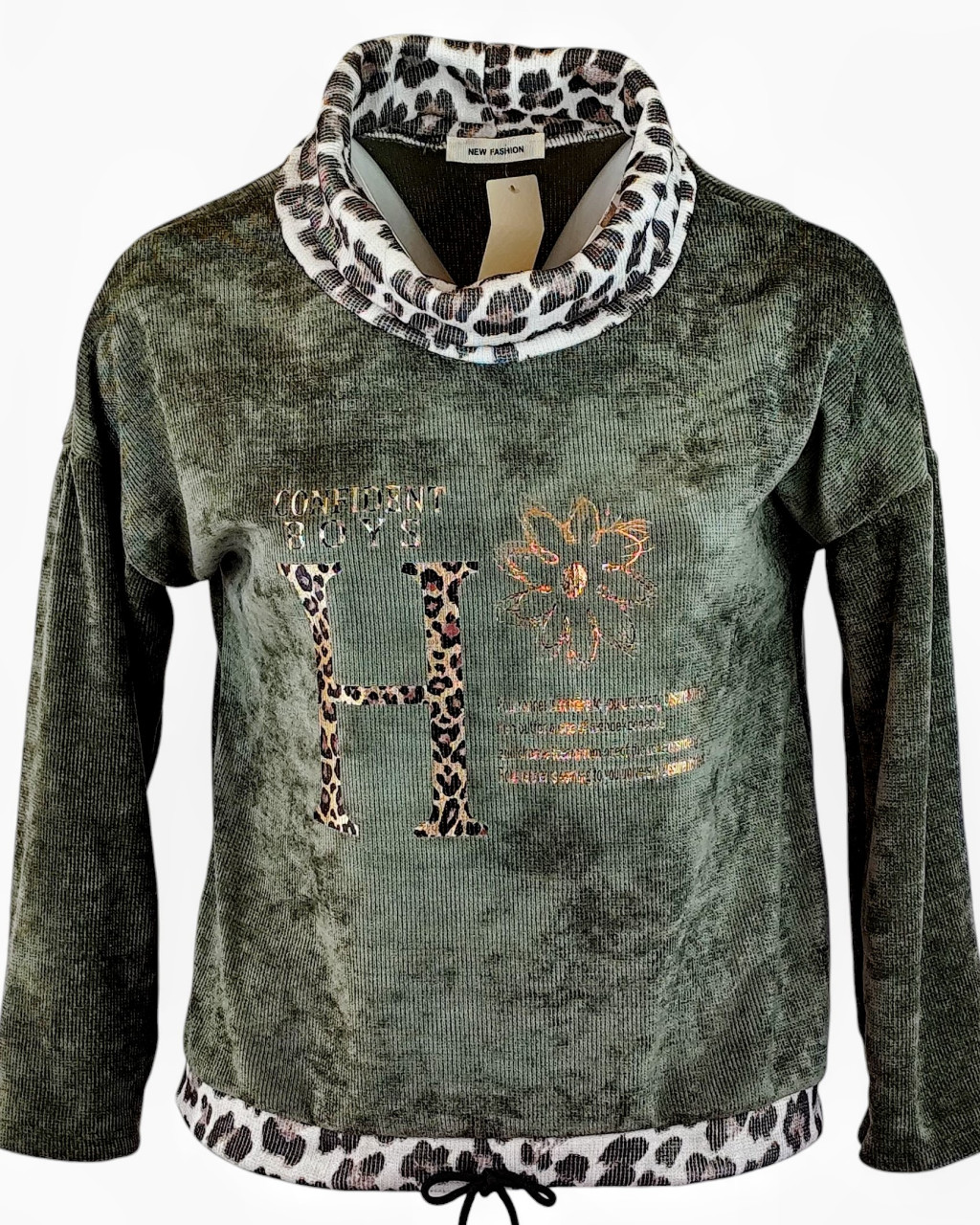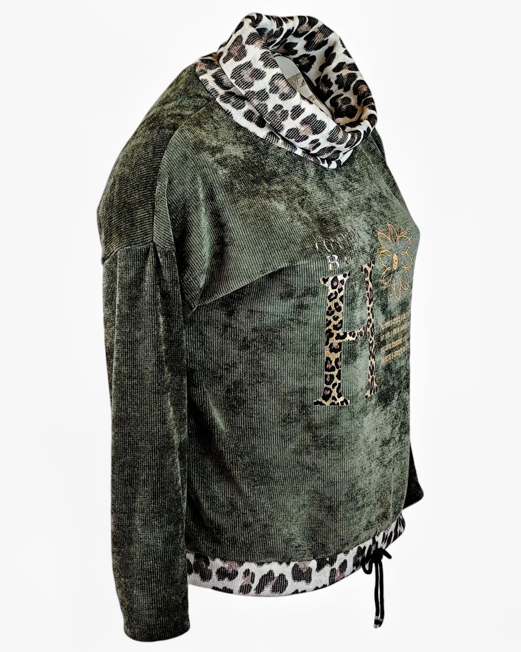 Vastag bordás anyagú, feliratos elejű, hosszú ujjú, garbó nyakú, fiatalos olasz felső, ocelot állatminta díszítéssel- keki zöld