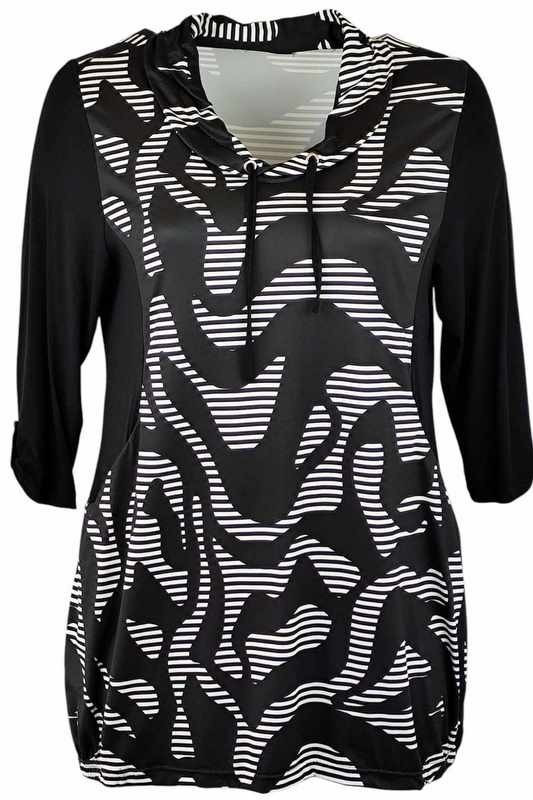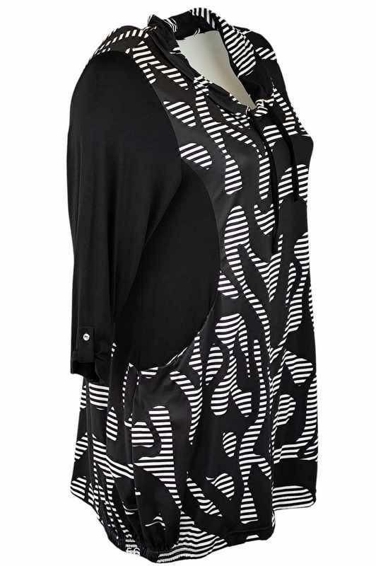 Antónia karcsúsító szabású, hosszított fazonú, 3/4-es ujjú, zsebes, viszkóz anyagból készült, eleje fekete-fehér csíkos, körgalléros környakú fiatalos molett lengyel tunika- fekete, fehér