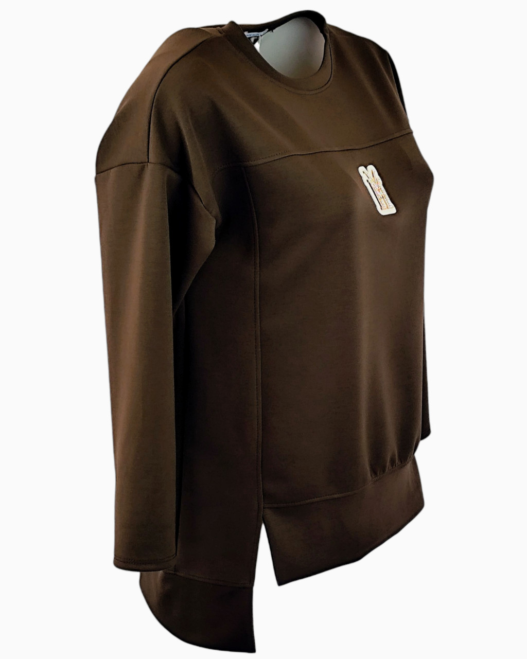 Egyszínű, kis arany táblácskával díszített, puntó anyagból készült, egyenes fazonú, hosszú ujjú, elől rövidebb, hátul hosszabb, fiatalos olasz vastagabb anyagú tunika- barna